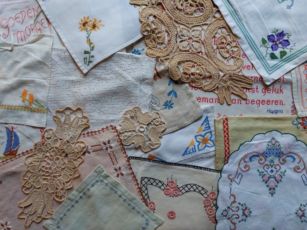 Van mijn jeugd af aan ben ik geboeid geweest door handwerk. Mijn moeder, mijn grootmoeder en mijn tante maakten mooi handwerk, en ik vond dat prachtig om te zien. Mijn moeder zag dat ik het ook graag wilde en gaf mij op de juiste leeftijden wat materiaal waardoor ik een nieuwe techniek kon leren en ontdekte dat ik het zelf ook heerlijk vond om te doen. Later kreeg ik de oude handwerkjes van mijn familie: kelimkleedjes, een geborduurde pianoloper, een pyamazak die mijn grootmoeder vroeger nog voor hรกรกr moeder had geborduurd, een paar boekomslagen en nog zo wat. Ik koesterde die oude handwerken en kreeg daardoor ook oog voor de handwerken van ร nderen. Telkens als ik wat tegenkwam op markten of in kringloopwinkels zag ik er de waarde van: gemaakt door vrouwen die ook hรนn huizen hebben willen verfraaien en daar vele uren voor hebben gehandwerkt.