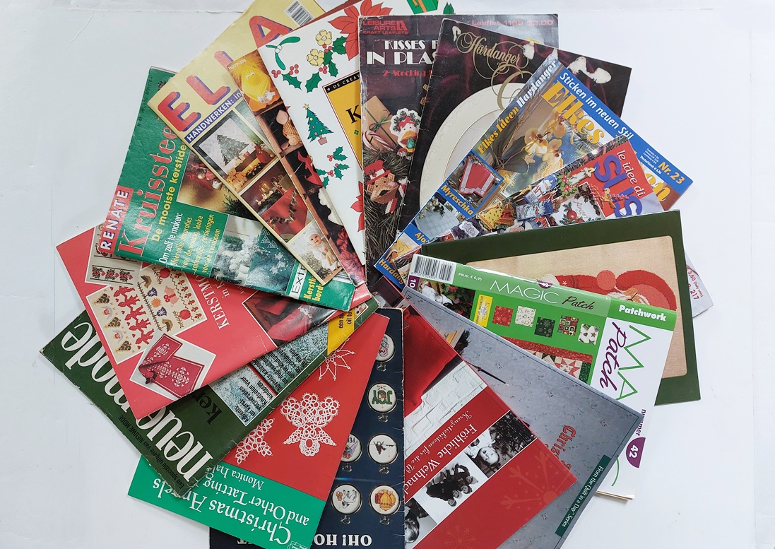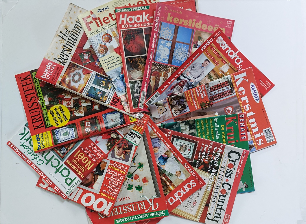 Kerst-ornamenten en -kleedjes en versieringen kunnen worden gehaakt, geborduurd, gebreid en eigenlijk elke handwerktechniek kan wel worden ingezet. De tijdschrift-redacties zochten dat allemaal uit, hoe die technieken bij konden dragen aan de kerstsfeer. Zo verscheen er bijvoorbeeld ook eens een boekje (wat op de onderste foto tussen de tijdschriften ligt) met patronen speciaal voor frivolité, om daarmee kerstversieringen te maken.