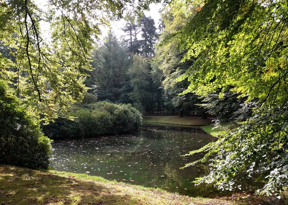 Hier wandelde ik vanmorgen! Ik had me opgegeven om met een groepje te wandelen, en bij deze vijver dronken we koffie. Ik bleef maar steeds kijken of ik de ijsvogel misschien zag, en ja, daar was hij! Hij vloog de hele vijver over. De blauwe flits, zo noem ik hem, en ik ben altijd blij als ik hem weer zie! Net zo’n blauw vogeltje als op het borduurwerk, dus dan weten we ook weer dat zulke blauwe vogeltjes ècht bestaan.