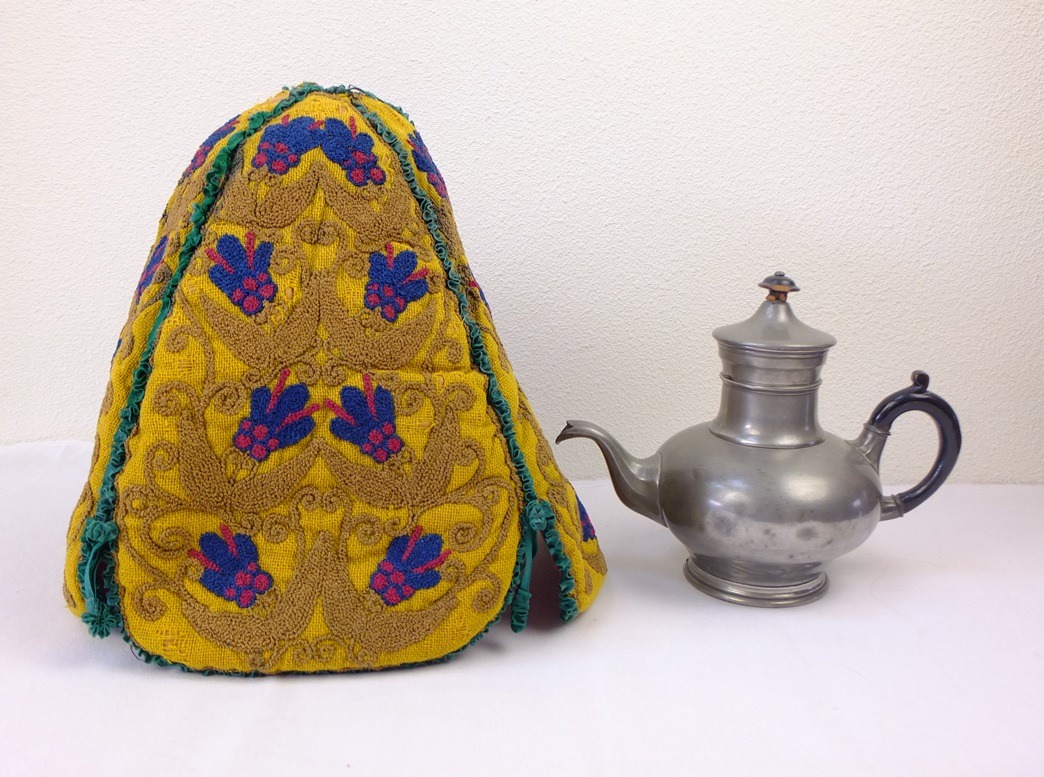 Deze week ontving ik een verre vriendin, met wie ik na twintig jaar gewoon weer verder praatte alsof we nog steeds bij elkaar in de buurt woonden, zoals vroeger. Dat was een bijzondere ontmoeting. En ik dronk ook thee met een nieuwe handwerkvriendin uit m’n woonplaats, met wie het enorm goed klikte. Ik had dus twee keer gelegenheid om bij m’n presentatie ook een antieke theemuts te betrekken, maar dat heb ik toch maar niet gedaan. Wel liet ik hem beide keren zien aan m’n bezoek, en nu ook aan jullie: deze oude theemuts van meer dan honderd jaar oud. Het is een museumstuk en hij is echt mooi! En ook te koop. Voor wie van antiek textiel houdt!