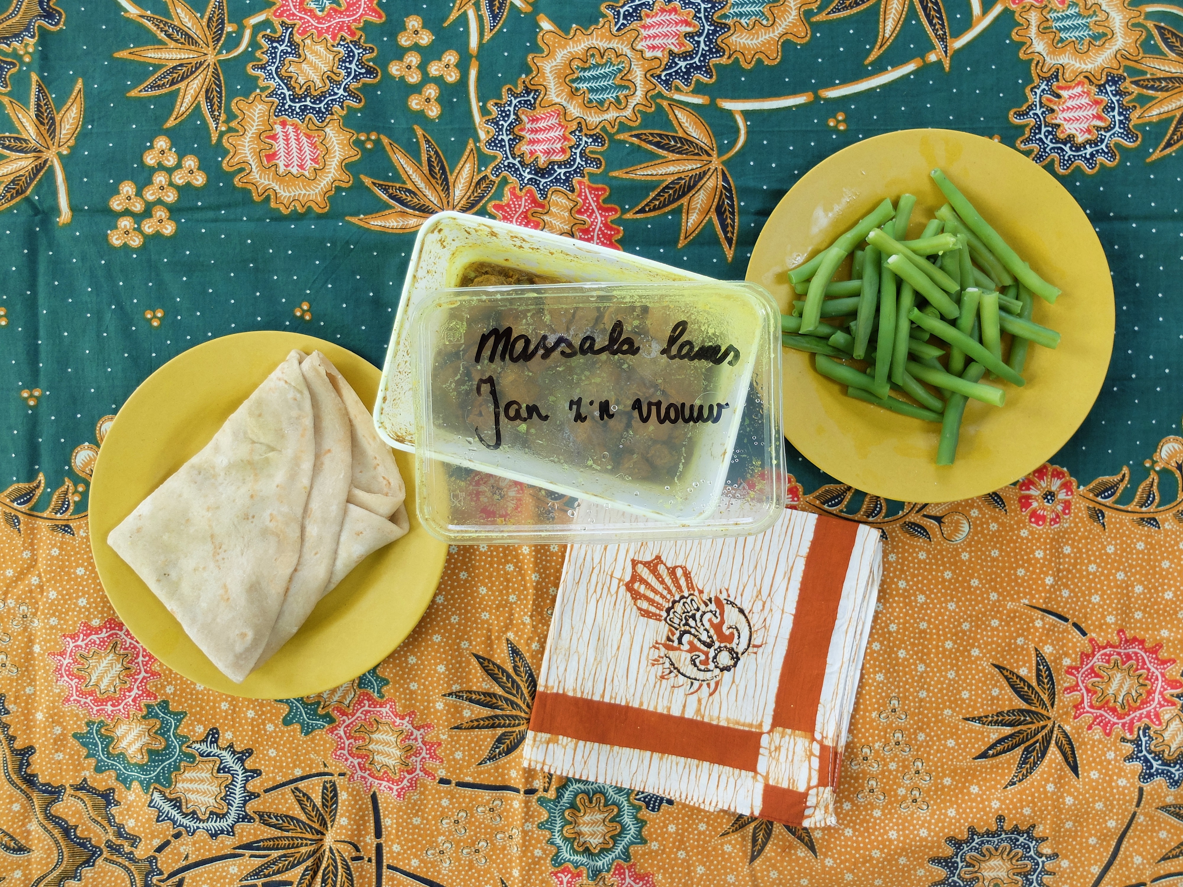 Een collega van mijn man maakt af en toe Roti voor de hele afdeling. Hij heeft Surinaamse roots en liet het hele team kennismaken met dit gerecht. Tijdje geleden hadden ze weer zo’n feestje en bij thuiskomst vertelde mijn lief hoe leuk het was, en vooral: hoe lekker het was. Ik denk dat ik precies op de goede manier heb gereageerd op zijn verhalen (die hij natuurlijk weer doorvertelde), want vanavond kreeg ik een verrassing: een speciaal-voor-mij bakje lamsvlees met massala en een paar roti’s. Die hoefde ik alleen maar op te warmen en daarna mocht ik ook eens proeven hoe bijzonder lekker dat is! Ik voelde me helemaal ‘Jan z’n vrouw’, want dat stond op het bakje geschreven.