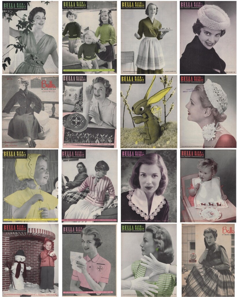 De mode was mooi en vrouwelijk in de jaren 50, met wijduitstaande rokken en smalle tailles. En vrouwen maakten haar huizen gezellig met kleedjes en kussens en daarvoor vonden ze patronen in het tijdschrift Bella handwerken. Dit tijdschrift verscheen vanaf het begin van de vorige eeuw en voorzag in een behoefte. (Huis)vrouwen gebruikten het om voor zichzelf en hun gezinnen mooie en bruikbare kleding te maken en te breien. Het is boeiend om deze oude nummers door te bladeren en erbij te bedenken hoe onze moeders en oma’s deze tijdschriften hebben gebruikt en meededen met de mode. Ook het tijdsbeeld van oude films is hierin terug te zien.