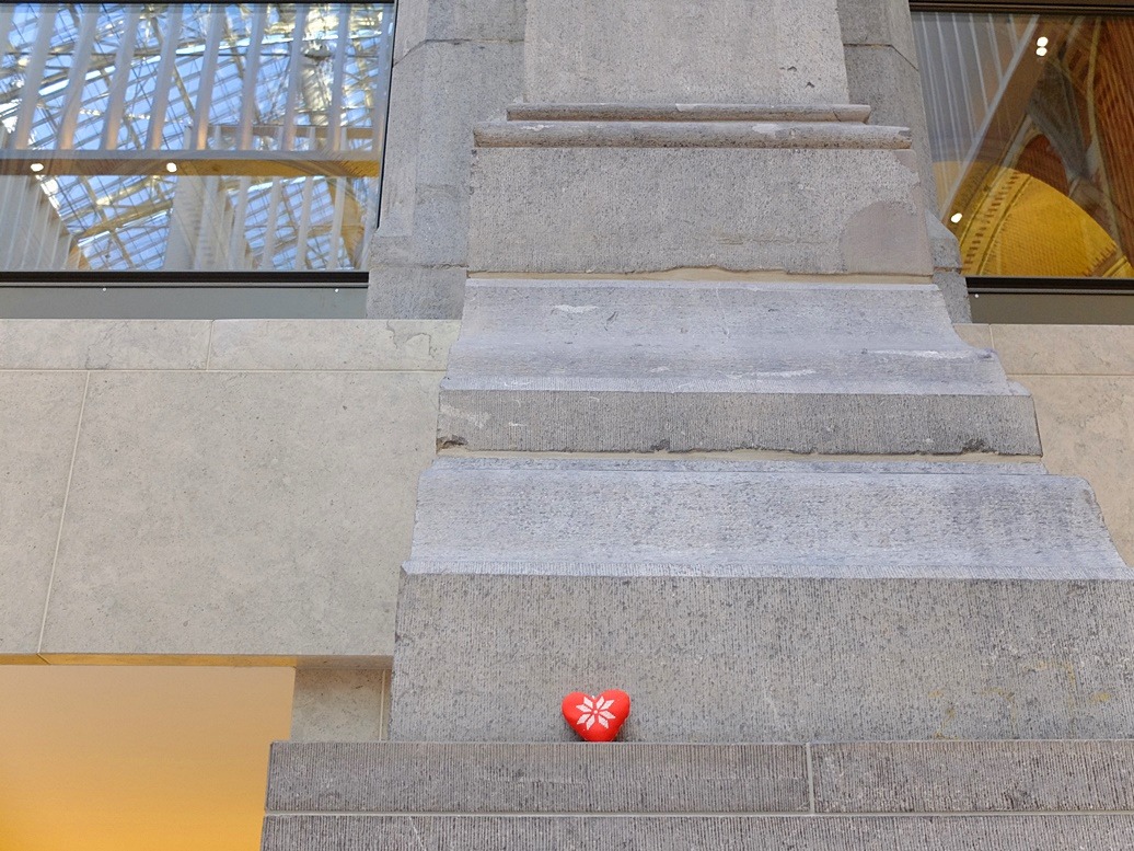 Net zo vreemd als het meenemen van een handwerkje naar een plek waar het niet hoort. Het is wel even grappig, een rood kersthartje tegen de grijze stenen van een indrukwekkend gebouw. Maar het hoort niet. Niet dáár. Zo voel ik het ook met het reageren op het nieuws. Het hoort niet op mijn blog, daar komen handwerkliefhebbers niet voor. Maar aan het eind van het jaar, na het zien van het journaal-overzicht…. ik kan er toch ook niet aan voorbijgaan?