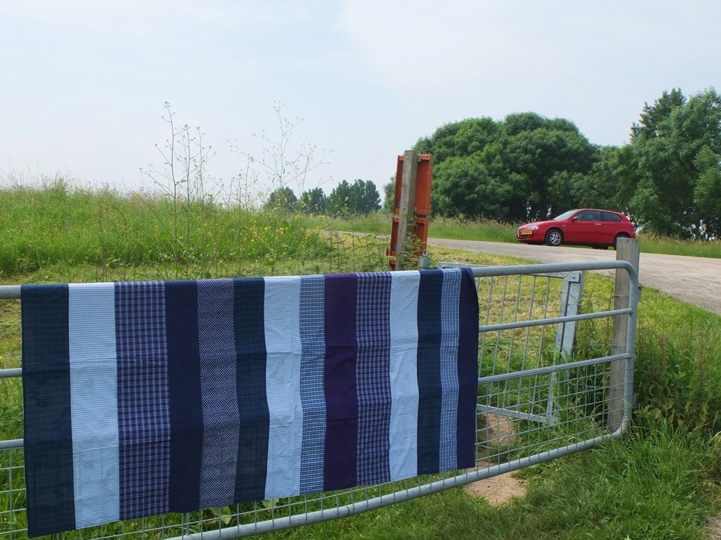 Vorige week afgemaakt: een strepen-patchwork laken. Om mee te nemen tijdens kampeervakanties. Soms is het dan te warm in de tent met een slaapzak en wil je alleen een laken om je heen. Dan voldoet een gewoon laken ook wel, maar dit is leuker. Ik maakte het van restanten blauw (ik ben nogal met blauw bezig) en vandaag nam ik het mee toen ik toch ergens naar toe moest. Ik wist dat daar in de buurt bij de Waal een geschikt hek zou zijn want ik was er al vaker geweest. En als je deze foto zo ziet, dan doe ik toch niets verkeerds, toch? Ik sta daar gewoon rustig met m’n fototoestelletje. Maar nauwelijks had ik deze foto gemaakt of een reusachtige traktor met een nog veel grotere oplegger komt met gierende banden veel te snel de dijk afscheuren, ramt mijn auto bijna, doet flinke wolken stof opwaaien en komt dan sidderend tot stilstand, een meter bij mij vandaan. Ik was van schrik al een stapje opzij gegaan, maar nog niet buiten het bereik van een boze stem. Of ik mijn auto maar zo gauw mogelijk daar weg wilde halen, want daar had hij last van. “U zou ook iets rustiger door de bocht kunnen gaan” probeerde ik nog. Maar daar had meneer geen oren naar, dus toen deed ik maar braaf wat hij zei. Tja, daarom hebben we af en toe een (kampeer) vakantie nodig. Maar soms denk ik ontmoedigd: maar waar is het dan wèl rustig? Nou ja, het laken ligt vast klaar!