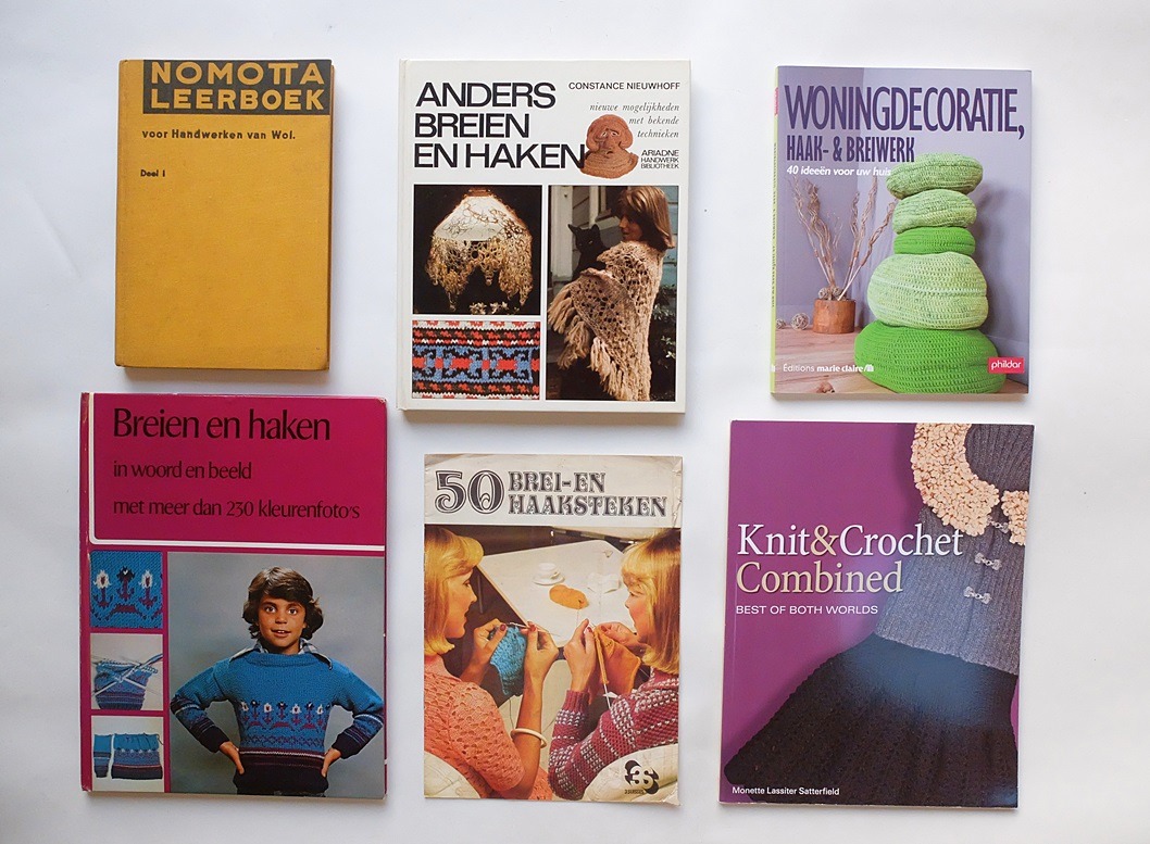 Maar wij weten dus inmiddels wel dat breien en haken volop in de mode zijn, en dat ook jonge vrouwen zijn aangehaakt! Superleuk! Vandaag een paar boeken in de aandacht die zowel over breien als over haken gaan. Lastig voor mij, want ik bewaar de foto’s van al mijn gepubliceerde boeken in mapjes. Moet ik ze nou in het brei- of het haak-mapje stoppen? Maar ook dat maakt niet uit; het gaat om het plezier! Dus met plezier presenteer ik deze oude boeken, die de vorige generatie volop gebruikte, en die ons nu opnieuw ter inspiratie zijn.