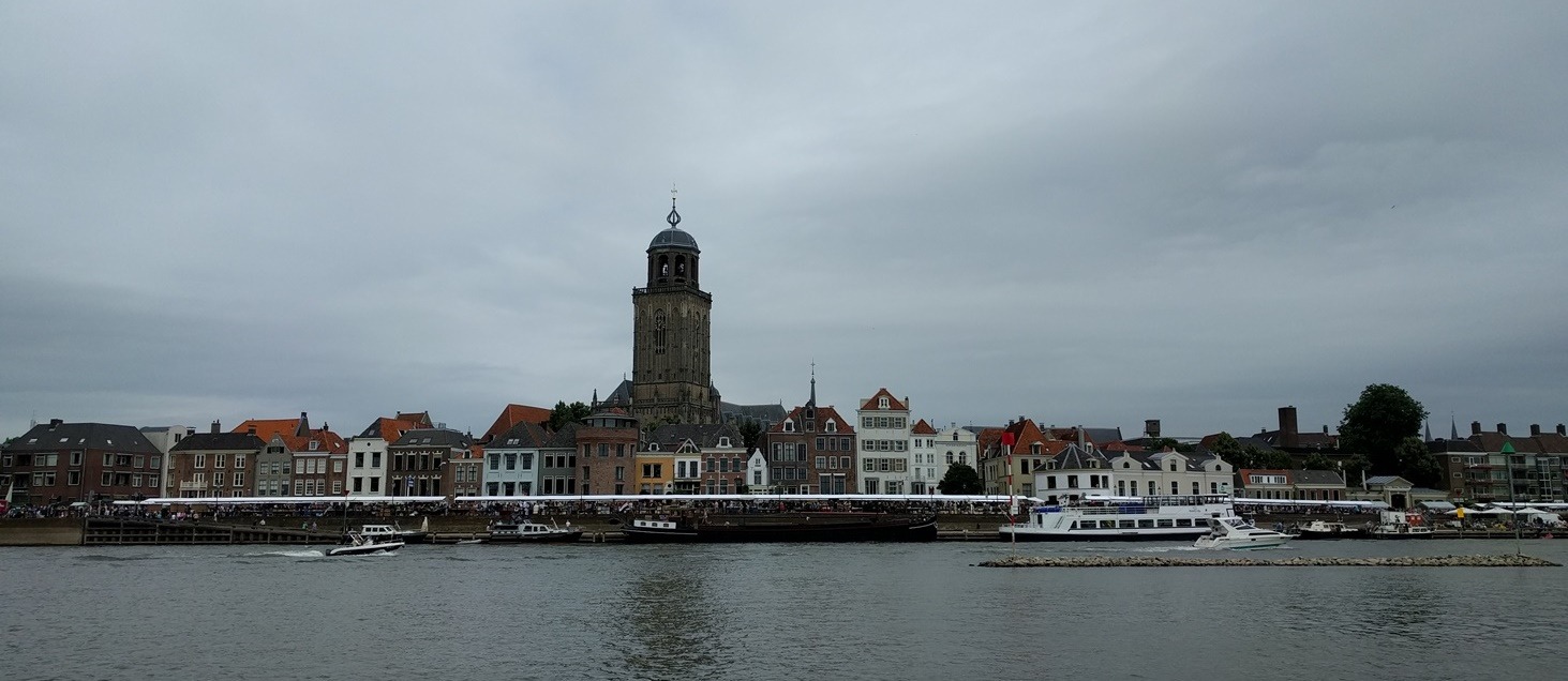Zicht op Deventer. ’s Morgens vroeg om kwart over zeven voeren we naar de overkant van de rivier. De rest van de dag voeren twee ponten af en aan en vervoerden boekenliefhebbers van heinde en ver. De jaarlijkse grote boekenmarkt. Een verslag in een paar foto’s.