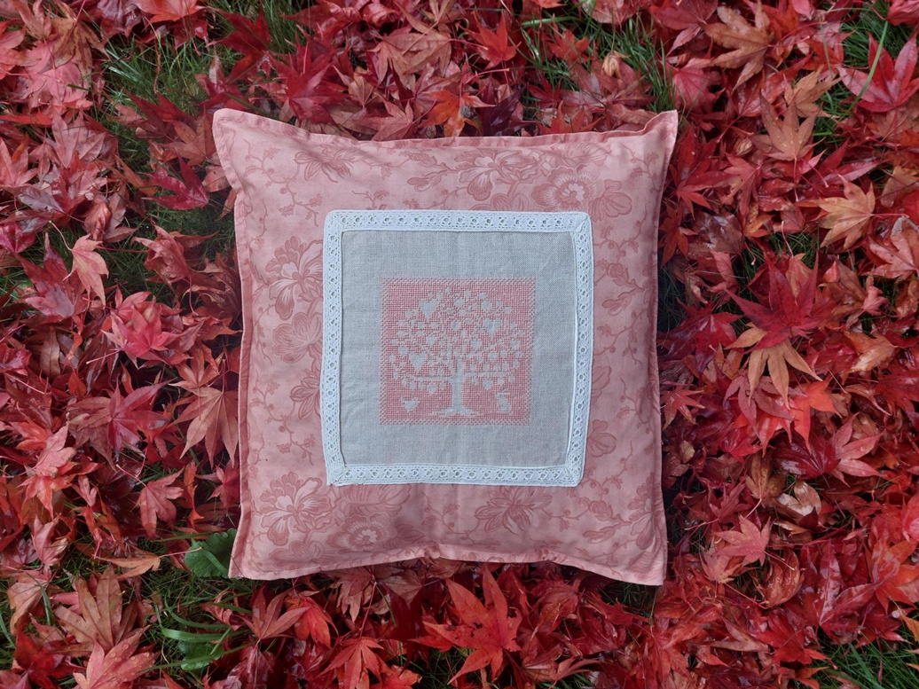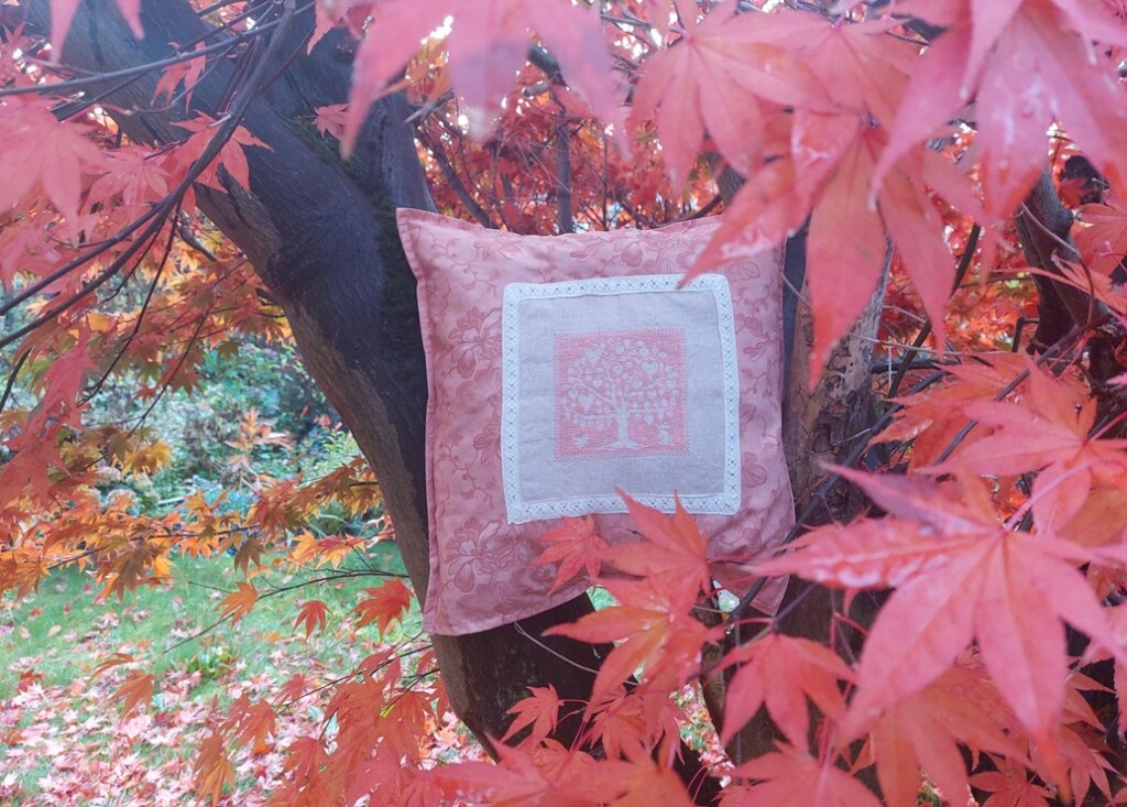 En als dan straks alle blaadjes op de grond zijn gevallen, dan geeft dat ook weer inspiratie, en heeft die ook al gegeven. Een borduurster borduurde een boom in uitsparingstechniek en naaide het borduurwerkje op een kussentje. Elke zondag genieten van kussentjes en natuur-rust. Fijne zondag!