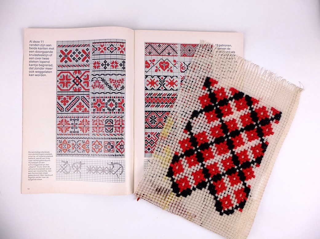 Zwart-en-rood is al eeuwenlang een geschikte combinatie om mee te borduren. Er zijn talloze folklore-motieven uitgevoerd in deze sterke kleuren en ook in onze tijd vinden we het weer boeiend. Ik ben bezig met m’n handwerkboeken door te bladeren en toen ik deze bladzijde weer zag…. Oh, wat mooi! Ik pakte een stukje stramien wat hier nog in de buurt lag (want ook m’n stramien ben ik aan het uitzoeken….) en zocht een paar restjes wol. Even uitproberen.
