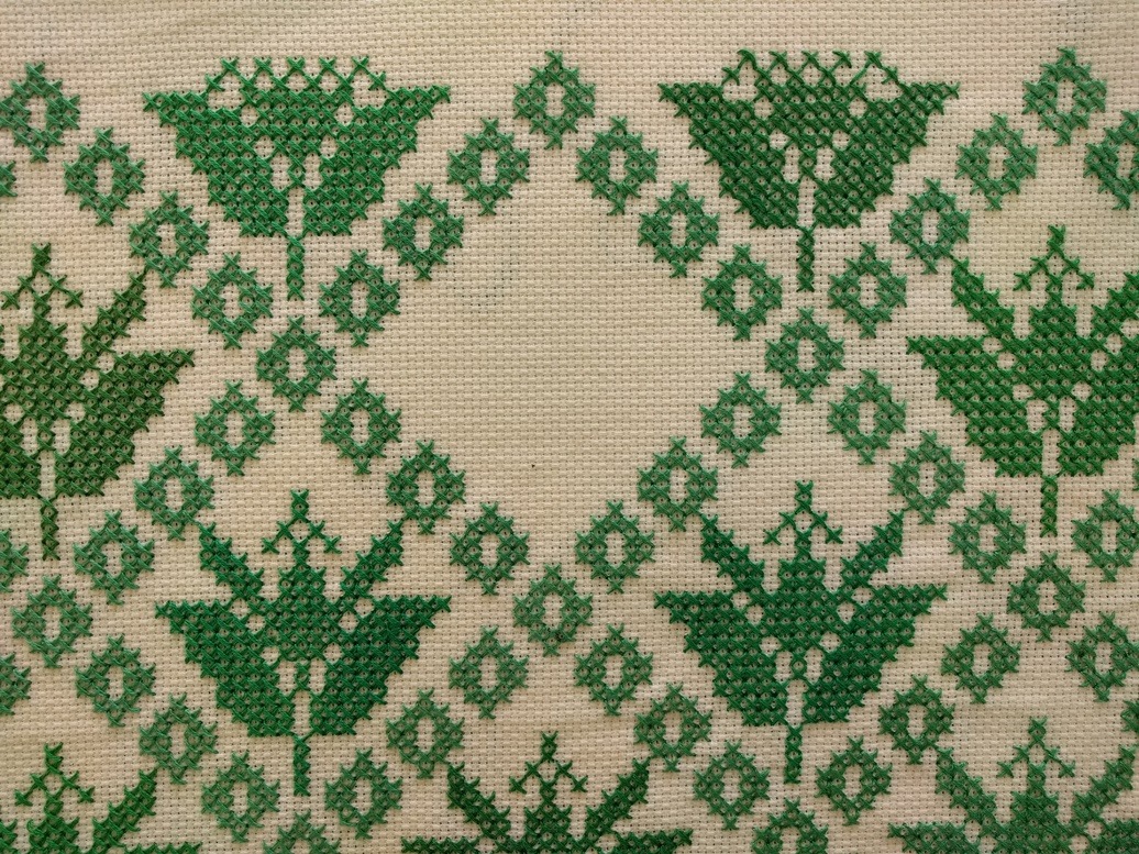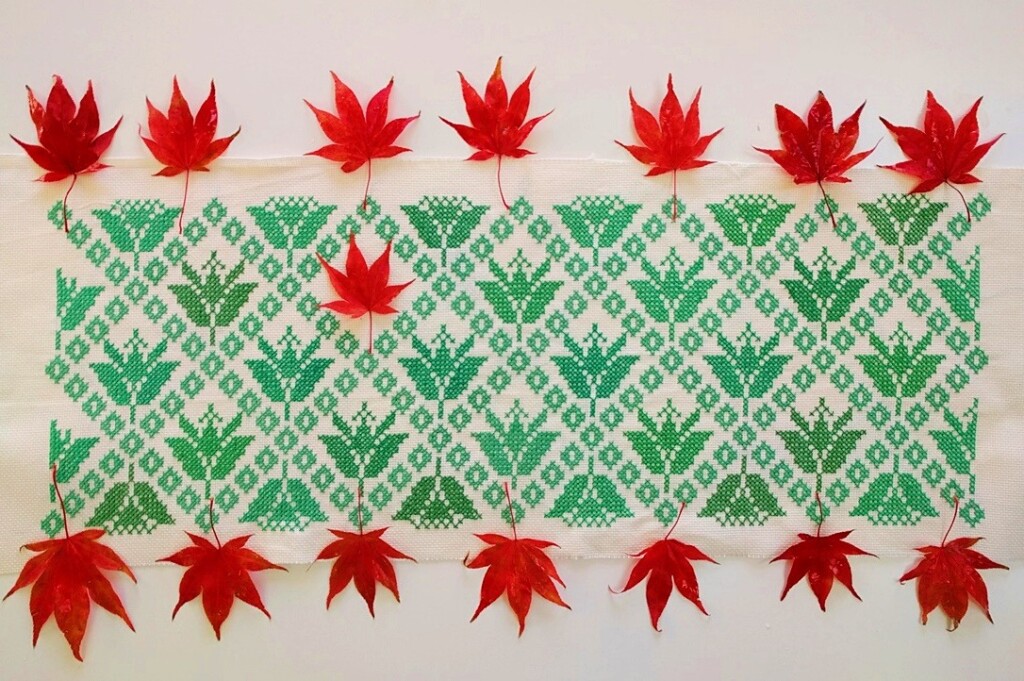 Het laatste motiefje borduren: daar maakte ik een feestje van! Ik liet één hokje open en met uitzicht op de vallende blaadjes in m’n tuin borduurde ik het laatste tulpje. Is het eigenlijk wel een tulpje? Je zou er ook een Acerblad in kunnen zien. Of Cannabis, maar dat had ik niet. Heb het nog wel geprobeerd te vinden trouwens….