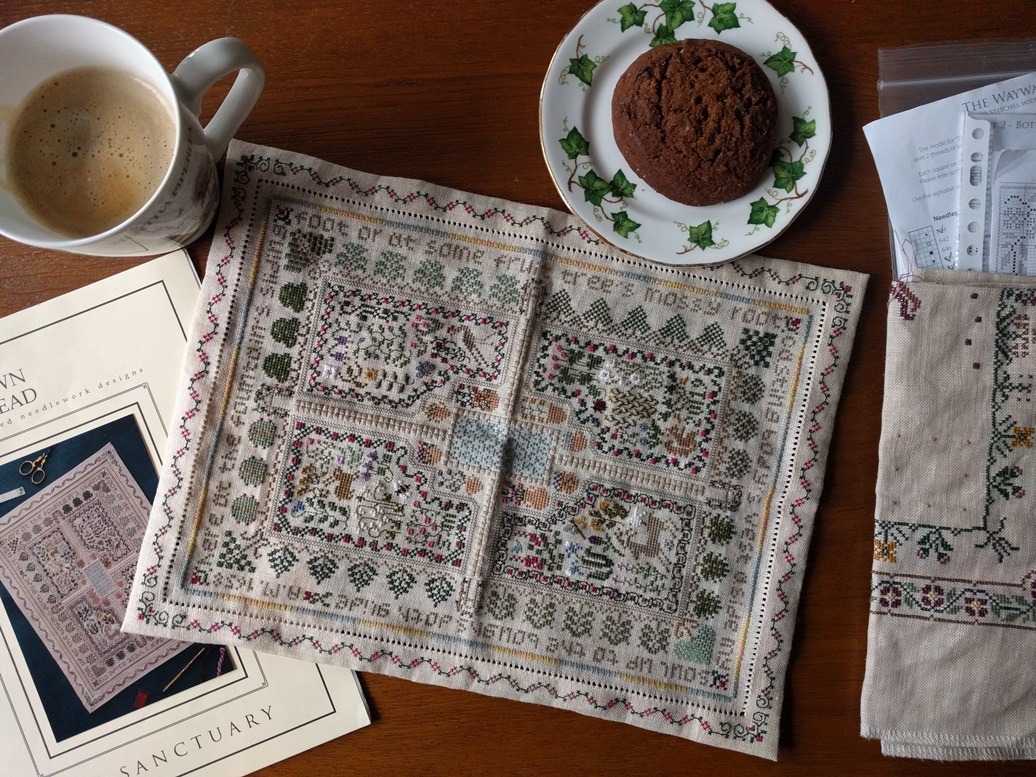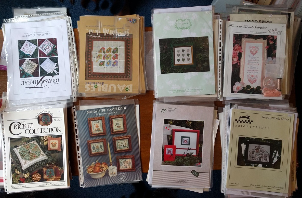 Hoe kom je aan een mooi patroon voor een nieuw borduurwerk? Patronen zijn volop te vinden in boeken, maar ze worden vaak ook ‘los’ verkocht. En er is heel veel keus! In een winkel, beurs of webshop kun je je verlekkeren aan al die prachtige patronen en dan is het soms nog moeilijk om je te beperken tot één ding. Dus zijn er ook vrouwen die meer kopen dan ze aankunnen, en dat komt gewoon omdat die plaatjes en pakketjes zo mooi zijn. Ik had een hele stapel van deze oude patronen, allemaal netjes bewaard in plastik mapjes. Sommige hebben het garen en het handwerklinnen erbij ingesloten, anderen hebben alleen het patroon. Vorig jaar liet ik die stapel aan m’n zus zien en zij kreeg eerste keus: zoek maar wat uit! Ze koos o.a. een pakket voor een Verborgen Tuin, met een middeleeuws gedicht erom heen. De uitdaging was dat hierin ook andere steekjes dan alleen de kruissteek in zijn verwerkt.