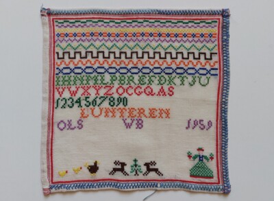 Het borduurwerk maakte ze af vlak voordat ik bij haar op bezoek zou komen en gister lag het op de salontafel te pronken toen ik bij haar kwam. Een tada-moment, compleet met koffie en een koek op het oude gebakschoteltje van onze moeder.