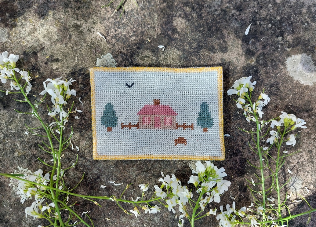 Nog steeds vind ik het af en toe leuk om een oud borduurwerkje van een ander op te knappen. Als ik iets tegenkom waarvan ik denk ‘ach, dat hoeft alleen nog maar een randje’, dan is het besluit al bijna genomen. “Alleen maar een randje”, en dan al gauw een leuk resultaat. Nu heb ik me dus met dit petitpoint-huisje bezig gehouden. Een lief tafereeltje van huisje-boompje-beestje.