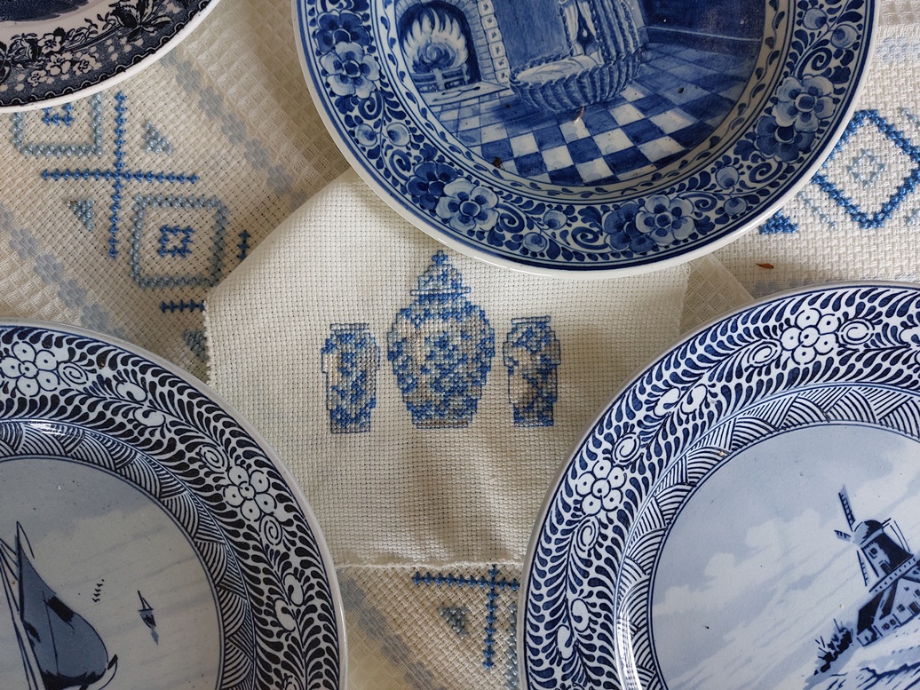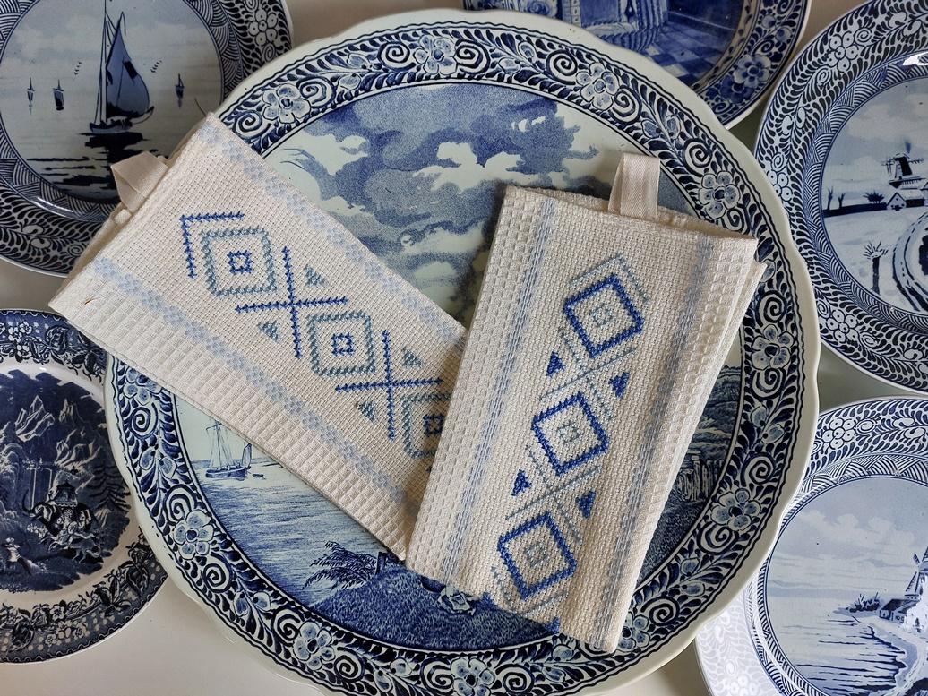 Veel borduursters zijn dol op blauw, en het borden-en-vazen-blauw komt ook goed uit in borduurwerkjes. De handdoekjes liet ik achter bij m’n dochter, maar het vazen-borduurwerkje is voor m’n shop. Zulke kleine borduurwerkjes kunnen altijd weer ergens voor worden gebruikt, bijvoorbeeld om het te verwerken in patchwork of om er een applicatie van te maken. Of gewoon inlijsten en tussen je eigen bordenverzameling plaatsen.