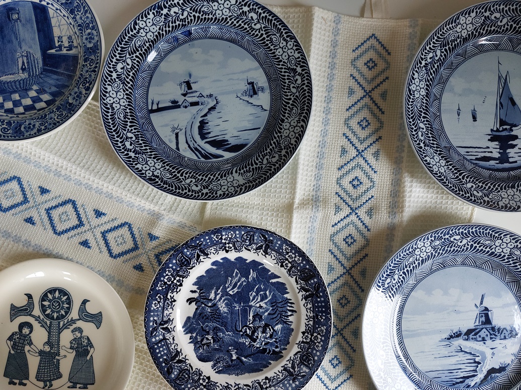 Oude blauwe borden zijn mooi om naar te kijken, maar je kunt er ook nog gewoon van eten. Mijn dochter had een foto geappt van een paar nieuwe aanwinsten en toen bedacht ik dat ik een paar geborduurde handdoekjes wilde meenemen, want dat combineert mooi.