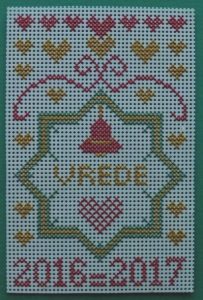 En m’n antwoord op de vraag die ze achterop de kaart had geschreven. Ja: deze luciferdoos! De sterren zijn geborduurd met goudkleurig garen op rood Bristol board. Niet met kruissteken maar met steelsteken. Dit vind ik een mooie toepassing van dit gaatjeskarton, en wie weet een idee voor anderen.