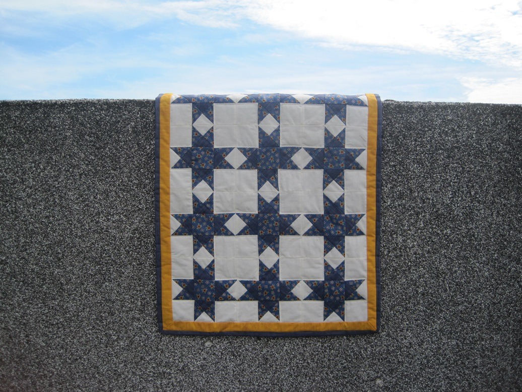 Aan één van die grote grijze hoge muren hing ik mijn oude twaalf-sterren-quilt. “Hallo, ziet u mij?”