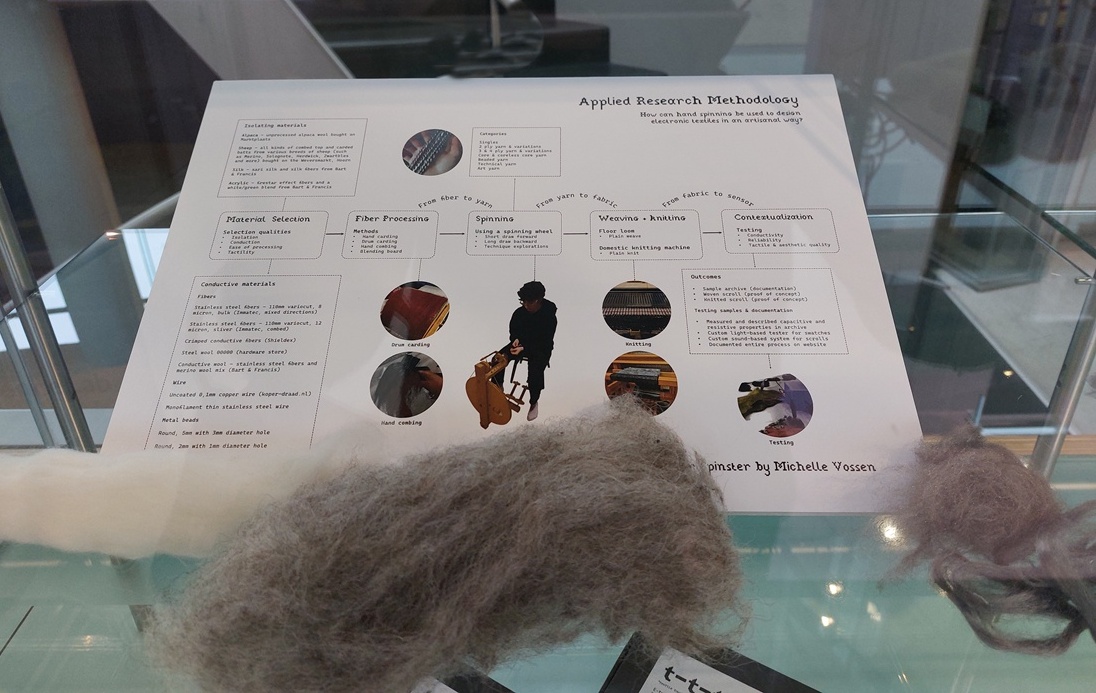 De deelnemende vormgevers en kunstenaars hebben ieder op een eigen manier textiele en ambachtelijke kennis gecombineerd met digitale technieken zoals programmeren, coderen en algoritmisch ontwerpen. In de (kleine) tentoonstelling lagen wat voorwerpen van innovatieve technieken en materiaal experimenten, maar die heb ik niet allemaal op de foto.