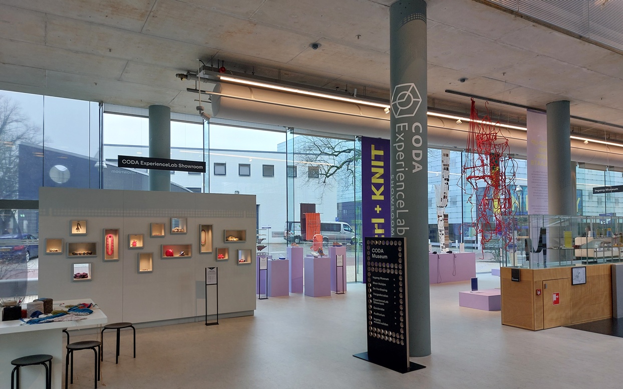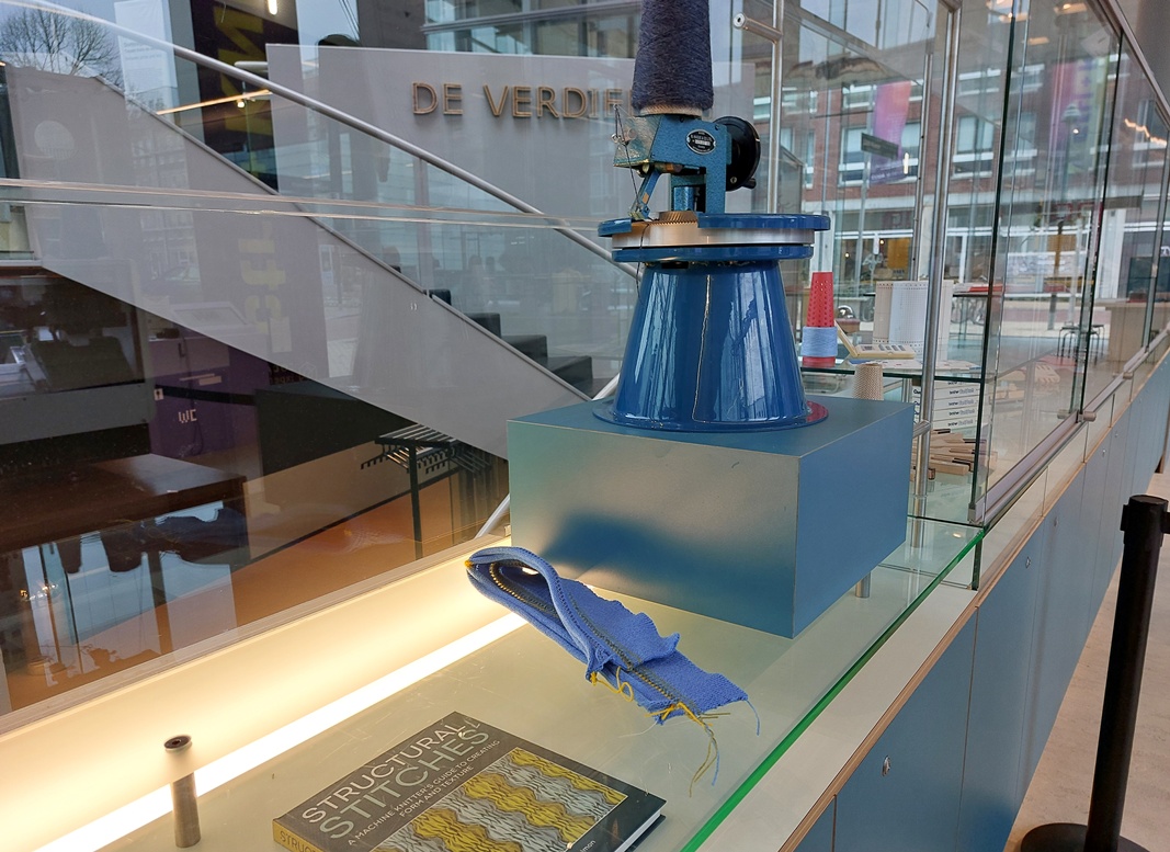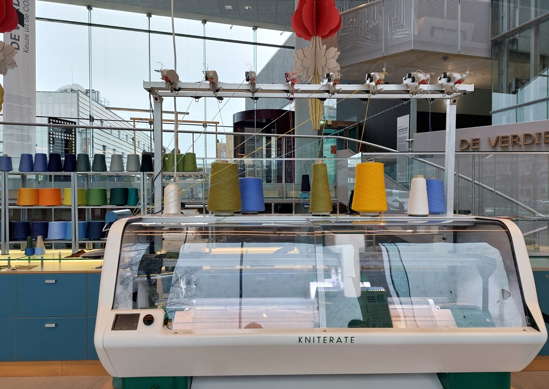 En dit is het paradepaardje van die tentoonstelling Ctrl + Knit, in de CODA (Cultuur Onder Dak) van Apeldoorn. Normaal staat hij in het Experience Lab, en kun je er ook cursussen op volgen. Ik sta naar die geavanceerde machine, de Kniterate, te kijken als ik wordt aangesproken door een vrouw naast mij: “Ben jij Margriet? Ik herken je aan je (zelfgebreide) trui.” Wat leuk, dat overkomt me niet zo vaak, maar zo’n tentoonstelling is natuurlijk wel een plek waar je me kunt verwachten.