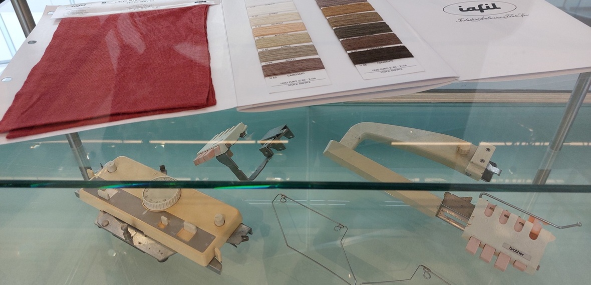 Breimachines werden in de twintigste eeuw vooral gebruikt om kleding snel en efficiรซnt te produceren, maar in onze tijd vinden die oude machines herwaardering als instrumenten voor experiment, onderzoek en artistieke expressie. Op de foto twee breimachines uit de negentiger jaren. Nu worden die oude machines ingezet voor een nieuwe exploratie. Bij ‘Digitaal breien’ gaat het om het wederzijds versterken van traditie en technologie.