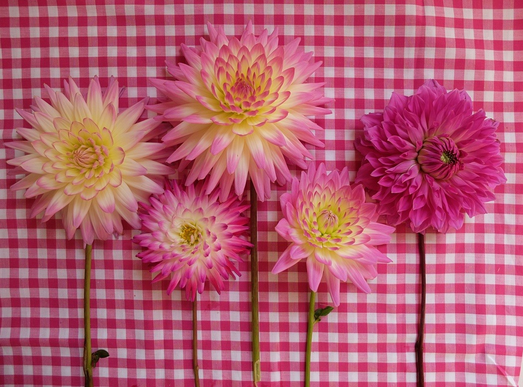 Vorige week plukte ik in een pluktuin een lading Dahlia’s. Tijdens een kopje koffie zat ik er zo eens naar te kijken. “Dat vraagt om een ruitje”, vond ik.