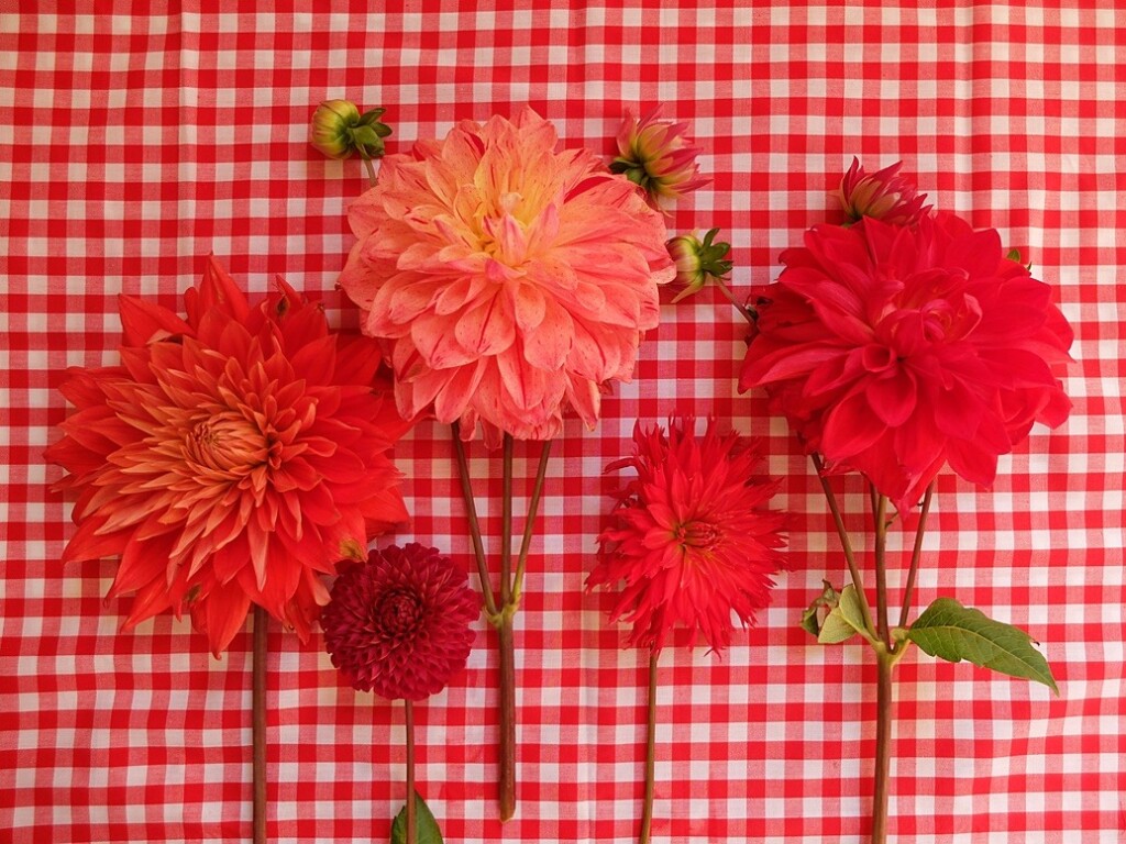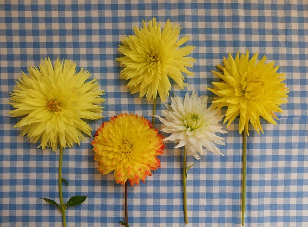 Vorige week plukte ik in een pluktuin een lading Dahlia’s. Tijdens een kopje koffie zat ik er zo eens naar te kijken. “Dat vraagt om een ruitje”, vond ik.