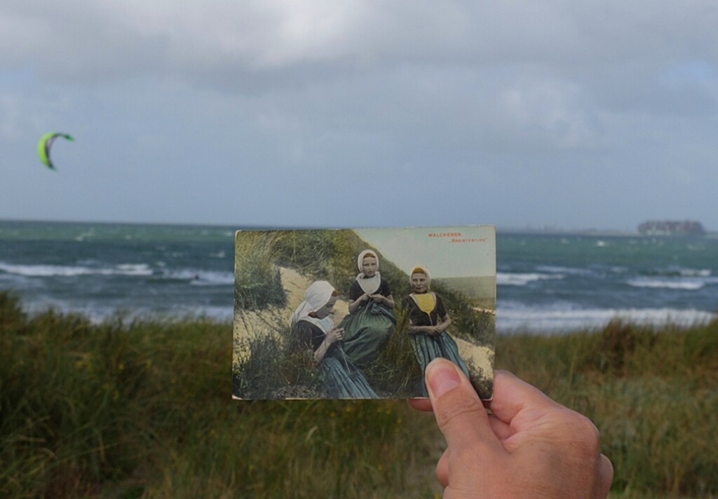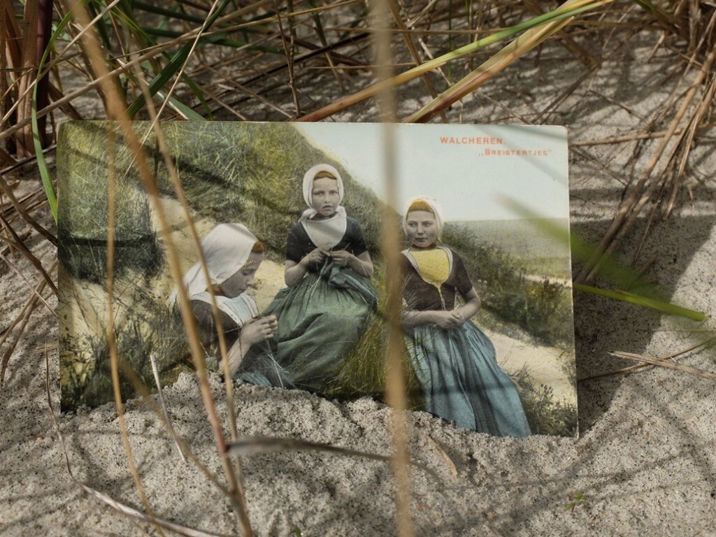 Een oude ansichtkaart met drie breiende meisjes in de duinen had ik meegenomen op vakantie, en op de laatste dag vond ik nog een mooi plekje om hen te fotograferen. Een groot schip met zeecontainers is net voorbijgevaren, en op de voorgrond scheert een windsurfer scherp over de golven. Twee zichtbare tekens van hoe we nu in de moderne tijd leven. Maar de duinen zijn onveranderd, en in Zeeland is het makkelijk om je een indruk te vormen van hoe deze meisjes vroeger hebben gezeten. Ik heb er steeds aan moeten denken tijdens onze vakantie. Een week lang mocht ik weer als moderne en rijke burger genieten van strand en zee en niks-hoeven, maar honderd jaar geleden was dat heel anders. Ook deze meisjes wilden vast wel eens even buiten zijn, en genieten van de zon, maar de breipennen moesten mee. We kunnen er tegenaan kijken als een mooi plaatje, maar het zal ook wel vaak bittere ernst zijn geweest: het werk voor die dag moest af!