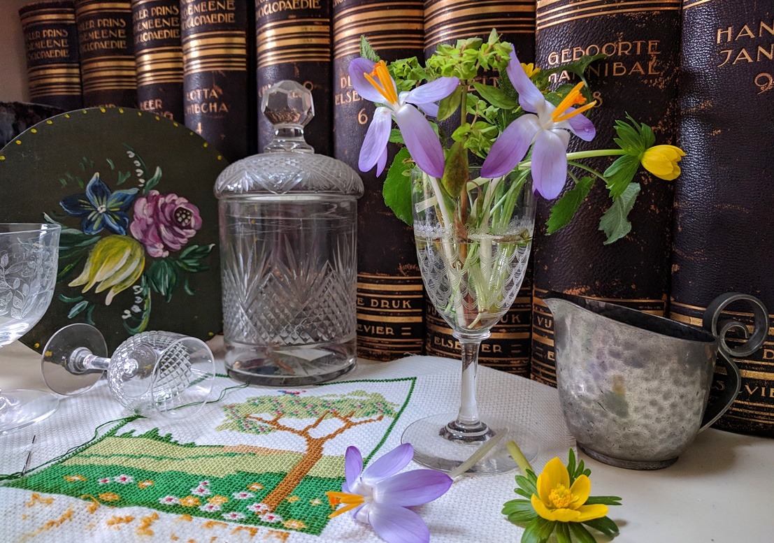 Even naar buiten voor wat foto-bloemetjes. Er is sneeuw voorspeld en dan komen die dappere crocussen en winteraconieten opnieuw onder een witte laag. Eens kijken hoe ze er nu bij staan. Dat vind ik altijd leuk: speuren naar de eerste bloemetjes! Het is nogal een ‘leuk’-blogje, want ik weet nog iets wat onder die noemer valt: de bloempjes in een kristallen glaasje zetten. Daar zijn die glaasjes prima geschikt voor. Al na een half uur waren de crocussen helemaal opengebloeid: Leuk toch?