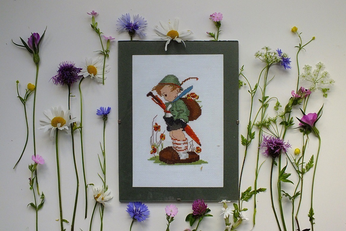 (En over dit borduurwerkje nog: het staat al wat langer in m’n shop en is heel geschikt om los te halen uit het lijstje en te verwerken tot iets anders. Zo vertederend: een jochie wat de wijde wereld intrekt maar bij het eerste bloemetje al blijft steken…)