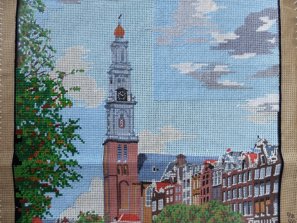 Het borduurwerk van het zicht op de Westertoren is nooit afgekomen. Een rechte streep heeft de blauwe lucht abrupt een halt toegeroepen.