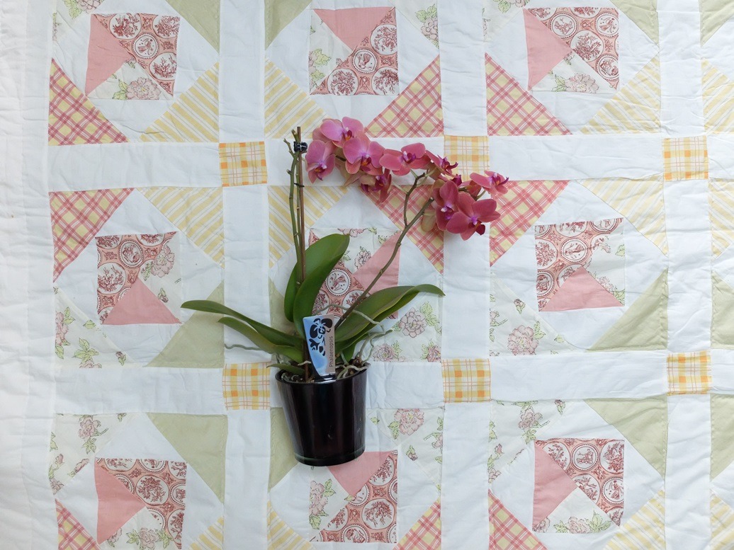 Voordat ik het dekbed opstuurde, maakte ik nog even betere foto waarop het patroon te zien is. Met een orchidee uit het ziekenhuis. Deze dunne zomerse quilt was lang geleden te bestellen bij Ariadne en ik herinner me nog uit die tijd dat ik hem zo mooi vond.
