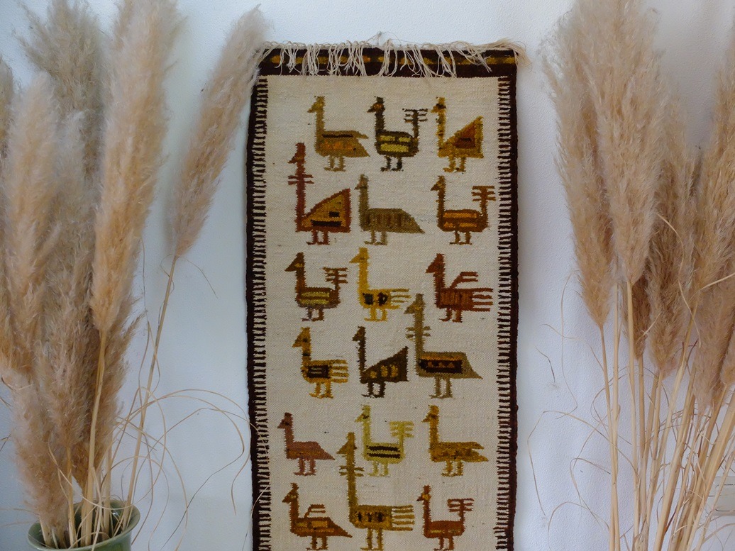 Vreemde vogels en exotische dieren werden ook veelvuldig in tapijten en kleden geweven en verwerkt. Hieronder één van mijn geweven kleden die nu weer in m’n kamer hangt. Ik vind het een fascinerend kleed.