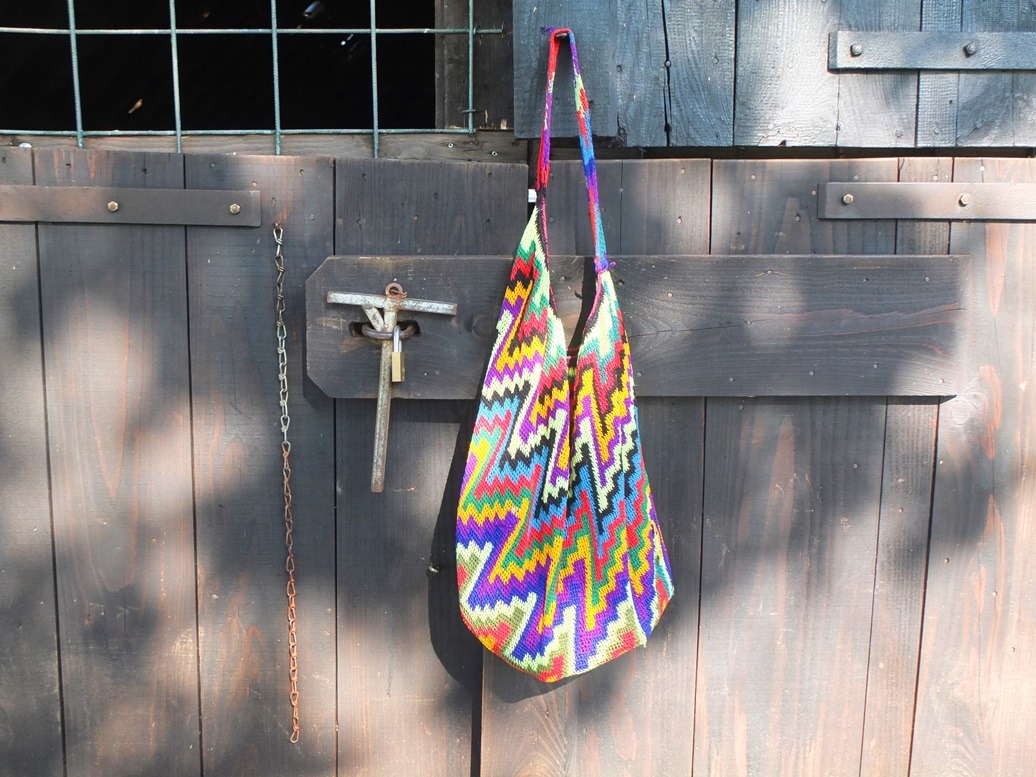 Na een kort bospad kwamen we bij de grote stille vlakte terecht die ‘Loenermark’ heet. We waren hier al een paar jaar niet meer geweest en zagen dat er nu niet één schaapskooi staat, maar twee. De tweede (nog in aanbouw) is veel groter en is nodig om de grote schaapskudde onder te brengen. We bewonderden de bouwwerken en ik hing de bilum op die ik bij me had. Ik dacht dat dat wel mooi zou zijn: de felle kleuren tegen de zwarte achterwand.