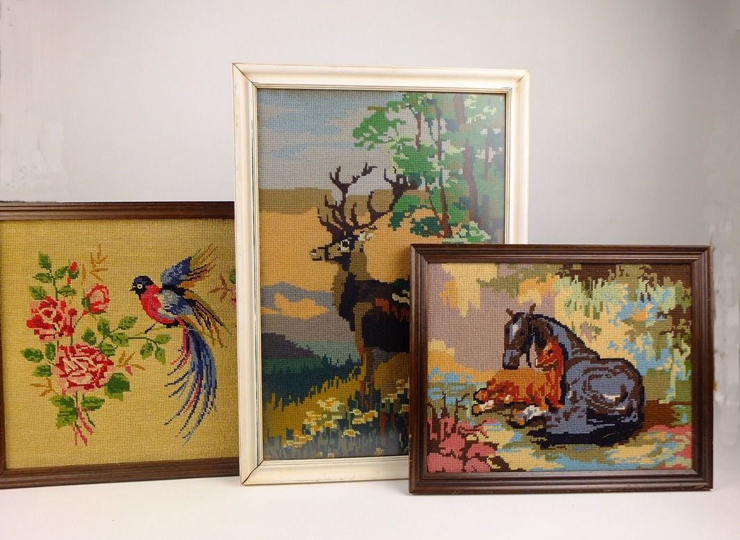 Voor ons werd het tijd om dit paradijselijke plekje weer te verlaten. Terug naar de drukke stad (wat me niet altijd meevalt). Geen dieren gezien, wel drie mooie tapisserie-schilderijen gekocht. En nu is het zondag en is het weer omgeslagen. Voor de schapen op de Loenermark wordt goed gezorgd, de zwijnen en herten hebben een groot Veluws gebied waar ze lekker hun gang kunnen gaan, de vogels kunnen vliegen waar ze willen. Af en toe wil ik wel eens wat dieren zien, en wil ik jaloers zijn op hun mooie en rustige omgeving. Hoewel ik ze gisteren niet in het echt heb gezien, heb ik ze in geborduurde versie toch in huis: