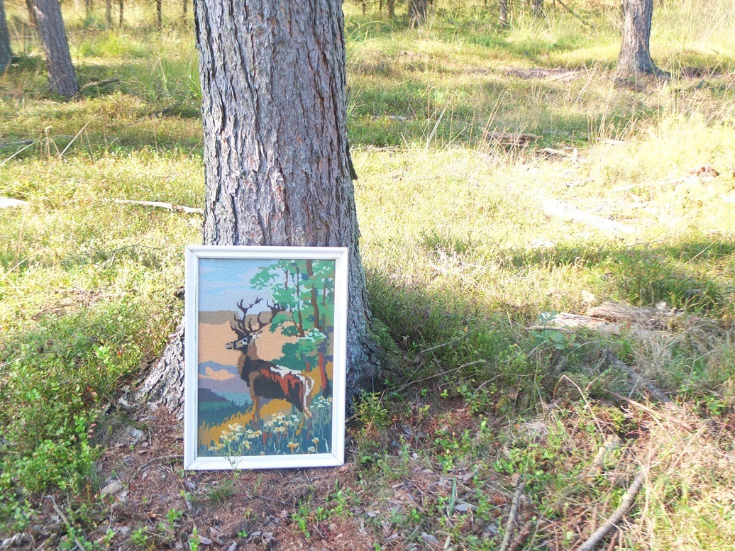 Toen we weer terug waren bij de auto, hadden we wèl heel veel sporen van dieren gezien, maar geen dieren zelf. Rond de parkeerplaats was de grond losgewoeld door de wilde zwijnen. Dat is overal op de Veluwe zo. Een groot probleem, waar natuurlijk wel een oplossing voor zou zijn maar ja…. Midden in die losgewoelde aarde zette ik dan nog maar een ander schilderij. Juist een paar uur geleden gekocht op die rommelmarkt. Een tapisserie-hert wat natuurlijk helemaal thuishoort in deze omgeving: