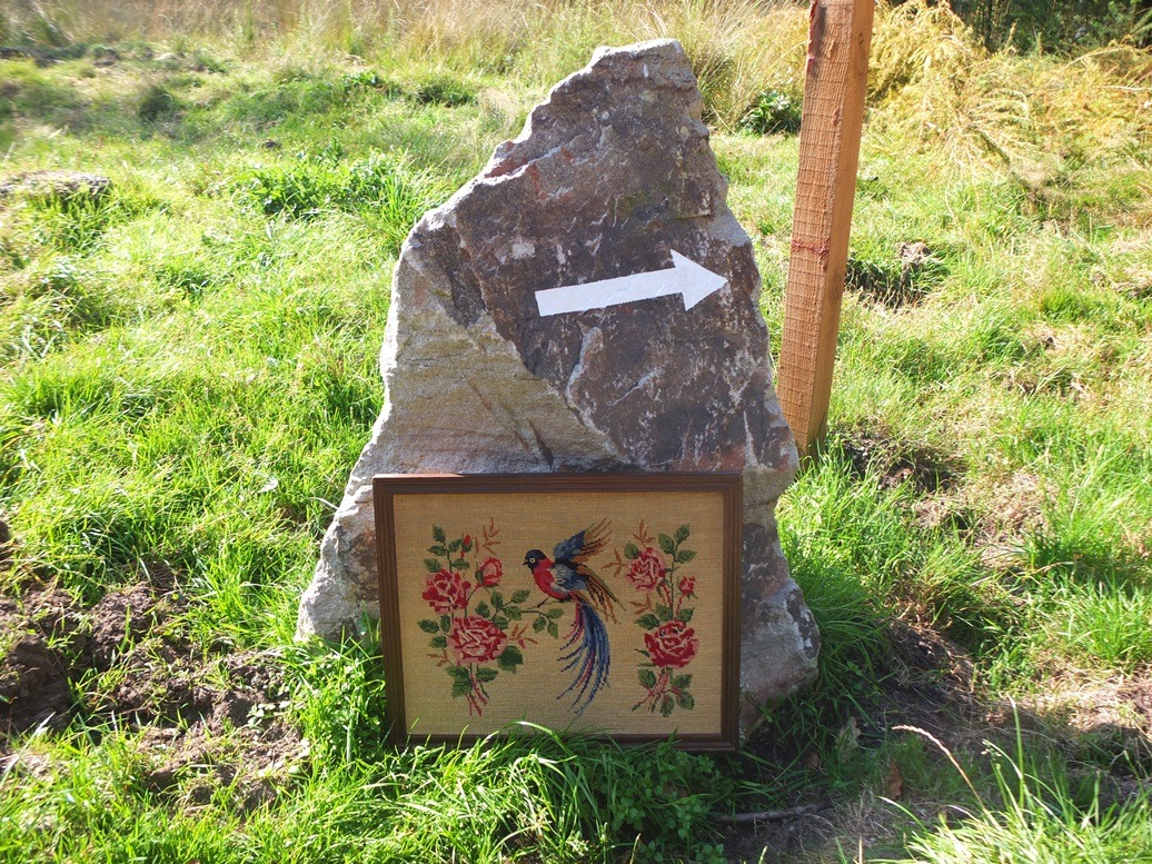 Tenslotte haalde ik nog een laatste nieuwe aanwinst uit de auto, om die in deze bijzondere omgeving te fotograferen. De prachtige staart van deze geborduurde vogel doet me denken dat dit wel eens een paradijsvogel zou kunnen zijn. Een vrije vogel, die kan vliegen waar hij wil en geen pijlen hoeft te volgen.