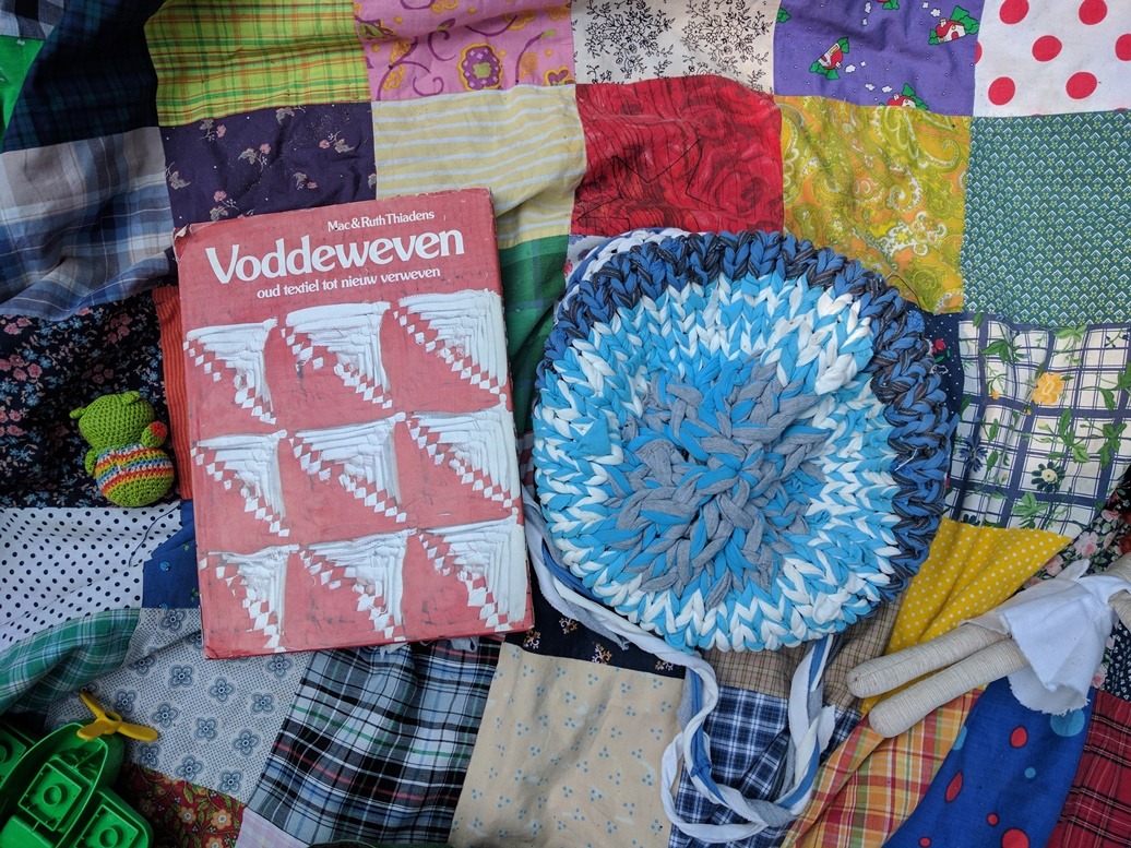 Het boek Voddeweven is het meest bekend als je bezig wilt zijn met resten stof en het heeft ook een hoofdstuk over de geschiedenis van het weven van voddekleedjes. Het kleinere boekje “Doe iets leuks met resten stof” is net als het andere boek ook een oorspronkelijk Zweedse uitgave (want deze traditie komt oorspronkelijk uit Scandinavië). Dit kleine boekje behandelt het Haken, Vlechten en Knopen van repen stof “tot een verrassend resultaat”. Breien staat er niet bij, maar dat kan dus ook, zoals m’n nicht liet zien.