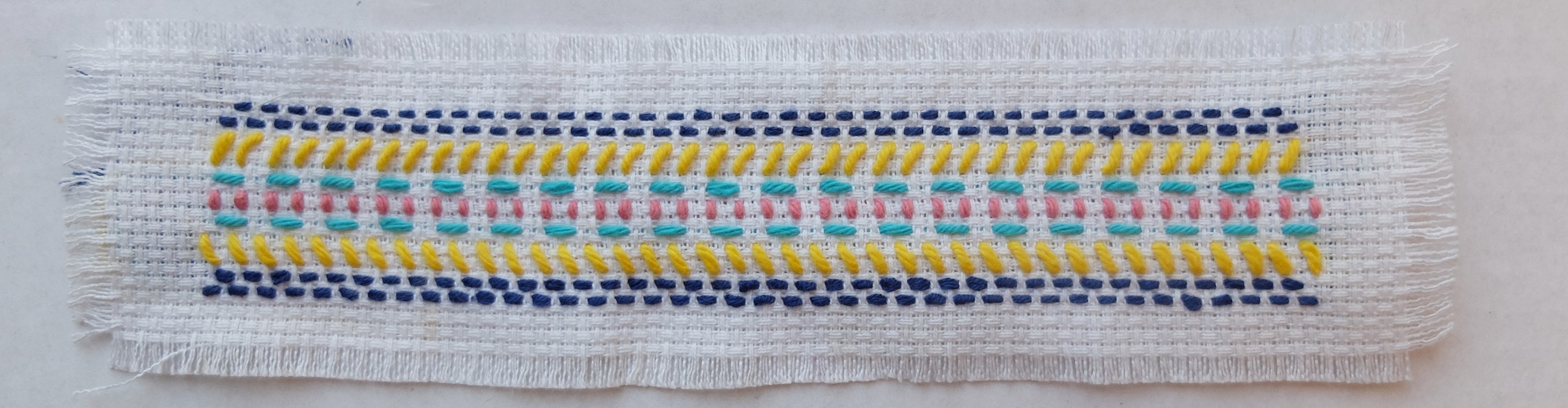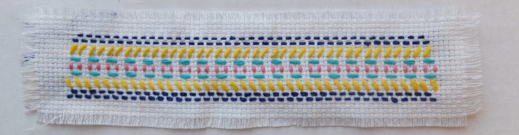 Er bestaat speciale doorstop-stof en daar kun je leuke effecten op bereiken. Ik blogde er een paar keer over en soms krijg ik vragen over oude blogjes. Iemand vroeg in m’n vakantie hoe ze aan die doorstop-stof kan komen. De stof is best lastig te vinden nog, maar er is ook een alternatief. De vragenstelster mailde dat ze het doorstoppen (op die speciale stof) vroeger op school heeft geleerd, en het nu graag met haar zoontje wil doen. Dat bracht me op het idee om deze boekenlegger te laten zien. Deze maakte mijn dochtertje vroeger (toen ze zeven jaar was denk ik) en toen m’n zoontje dat zag wilde hij het ook eens proberen. Ook voor jongens dus: goed voor de oefening van de fijne motoriek! Mijn gedachte is nu: als je de speciale doorstop-stof niet kunt vinden, dan kun je met een lapje aida-stof (zo heet de handwerkstof waar meestal op wordt geborduurd met kruissteek) ook leuke effecten bereiken. Het lapje op de bovenste foto laat dat zien. Gebruik dan geen dmc of borduurgaren, maar gewoon een katoenen draad, dat vult beter op.