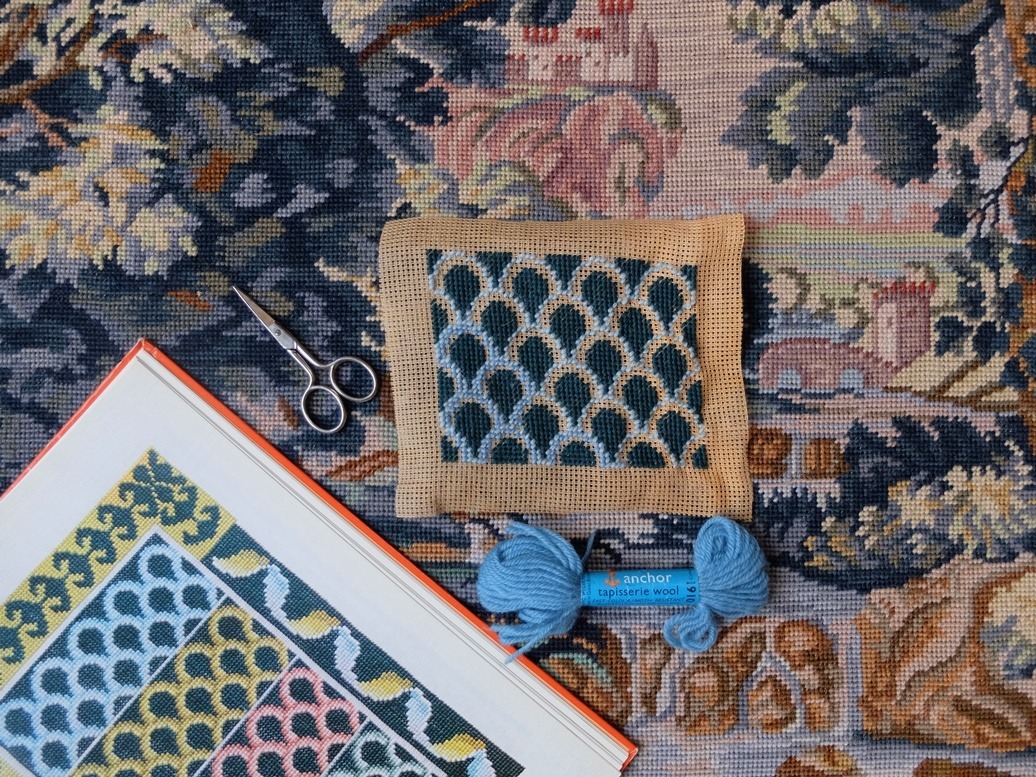 Ik borduur mijn kussentje nog snel af want ik wil het meenemen en weggeven. Het boek heeft oude mozaieken uit de eerste eeuwen van de christelijke geschiedenis omgezet in borduurpatronen. Dat past bij een gedachte die ik had voor dit kussentje, namelijk iets ouds en tijdloos te borduren.