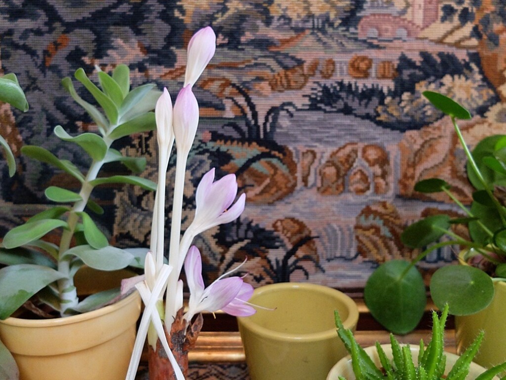 In m’n tuin zijn deze herfsttijlozen al wel uitgebloeid, maar ik had deze eind september gekocht als binnen-droogbloeier. Op advies had ik hem eerst een nog een flinke tijd koel weggelegd (om de bloei te vertragen), maar toen ik zag dat hij begon uit te lopen heb ik hem binnengehaald. M’n poging om hem als kale bol mee te nemen als kadootje was daarmee mislukt. Maar je hebt gelijk hoor, het is gewoon een herfstbloem, die in september en oktober meestal bloeit. Bedankt voor de tip om bloemen vroeg af te knippen, om te voorkomen dat ze zo snel verwelken buiten. Mijn bol gaat straks ook de tuin in!