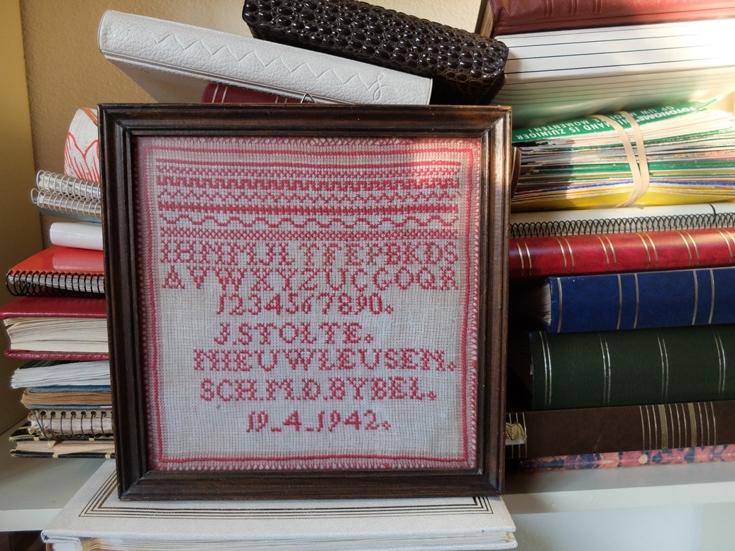 Een leven in foto’s. Geboren op een boerderijtje ergens in Overijssel, lopend naar de School met de Bijbel, later getrouwd en een gezin. Gezinsfoto’s, vakantiefoto’s, familiefoto’s, foto’s van uitstapjes en hoogtepunten. Allemaal in die oude fotoboeken. Gister kwamen de broer en zussen van m’n man bij ons om de foto’s te verdelen. Twee grote dozen vol met fotoboeken waren eerst aan elkaar doorgegeven geweest en iedereen had ze bekeken. En iedereen had kunnen aangeven waar hij of zij belangstelling voor had. En nu: een mooie middag met elkaar. Al die foto’s uit de boeken gehaald, op stapeltjes gelegd. Erover gepraat, herinneringen gedeeld. Waardevol, ontdekkend, verrijkend. Nog weer een stapje verder in het afscheidsproces. Nu staan die foto’s niet meer ergens op zolder, maar worden ze geïntegreerd in ieders persoonlijke geschiedenis. Foto’s van vorige generaties worden weer doorgegeven aan volgende generaties. En ook het merklapje uit 1942. Elf jaar was ze, toen ze dat maakte. Ze groeide op, en leerde nog veel meer bij op gebied van naaien en breien en borduren. Ze werd moeder en maakte van alles zelf. Later werd ze mijn schoonmoeder. En het was verrijkend om nog eens kennis te nemen van haar leven, via die oude fotoboeken.