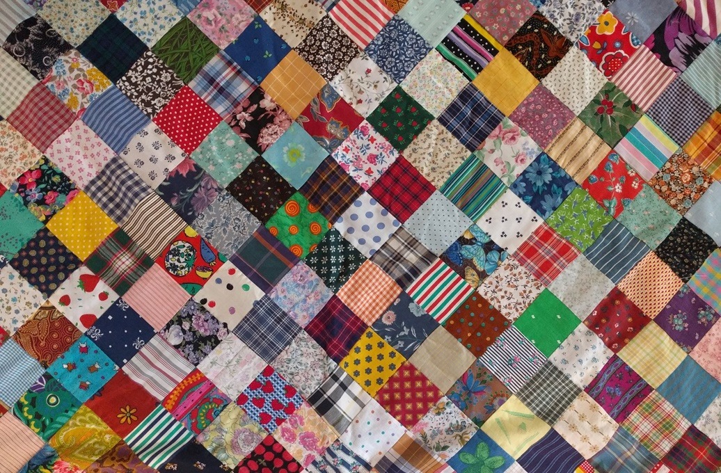 Het quiltje maakte ik vijftien jaar geleden als sampler van alle lapjes waar ik ooit wat mee had genaaid. Ik wilde dat elk lapje maar één keer voorkwam. Nu is dit oude quiltje geschikt om te gebruiken als picknickkleedje en als herinneringskleedje.