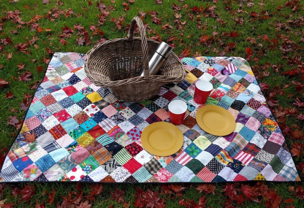 Wat een leuk idee! Zowel de “gesprokkelde” inhoud van de mand als het patchwork kleedje.
