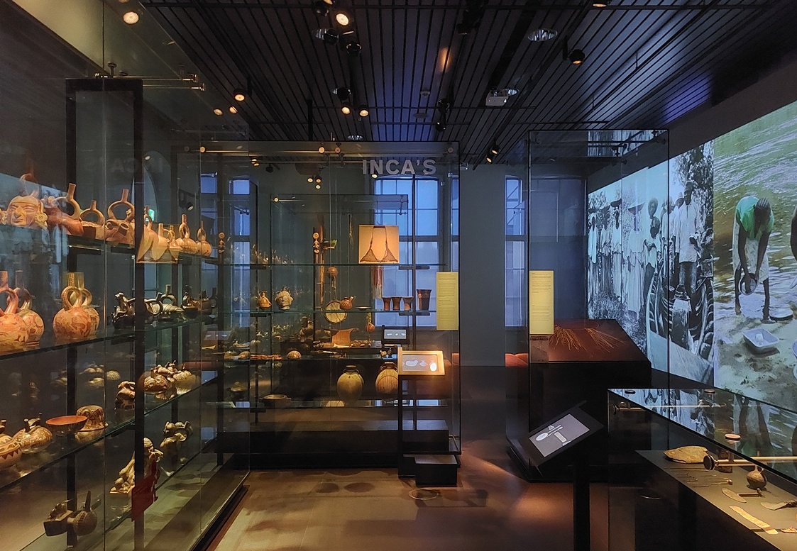 Maar zelf merk ik ook dat het best lastig is om alles goed in me op te nemen. Waarschijnlijk omdat de schittering van al die schijnwerpers in het halfduister gewoon niet lekker kijkt. De opzet van het museum is dat we door het bekijken van die vele voorwerpen uit andere culturen en andere tijden “de wereld om ons heen beter begrijpen.” (Dus dan kan het kennelijk ook dat een vitrine vol doodsmaskers je aanzet tot het doen van je eigen verhaal over je lastige kinderen…haha.) Volgens de introductietekst van het museum vertelt elk object een uniek verhaal, en dat zijn verhalen over universele thema’s zoals vieren, rouwen, versieren, bidden, liefhebben en vechten.