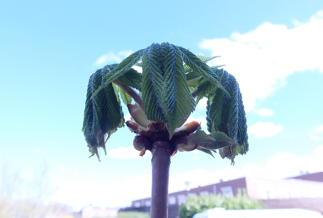 Voor mijn keukenraam heb ik een kastanje-in-een-pot. Dat gaat al een paar jaar goed en elk jaar komt er weer dertig centimeter bij. De ontwikkeling van dat bovenstuk is fascinerend om te zien en elke dag kijk ik er nu naar. Eerst zag ik de knop opzwellen en nu zijn de bladeren bezig zich te ontvouwen. M’n plan was om er elke dag een foto van te nemen omdat het zo snel gaat. Het lijkt wel magic, wat er allemaal uit die knop komt.