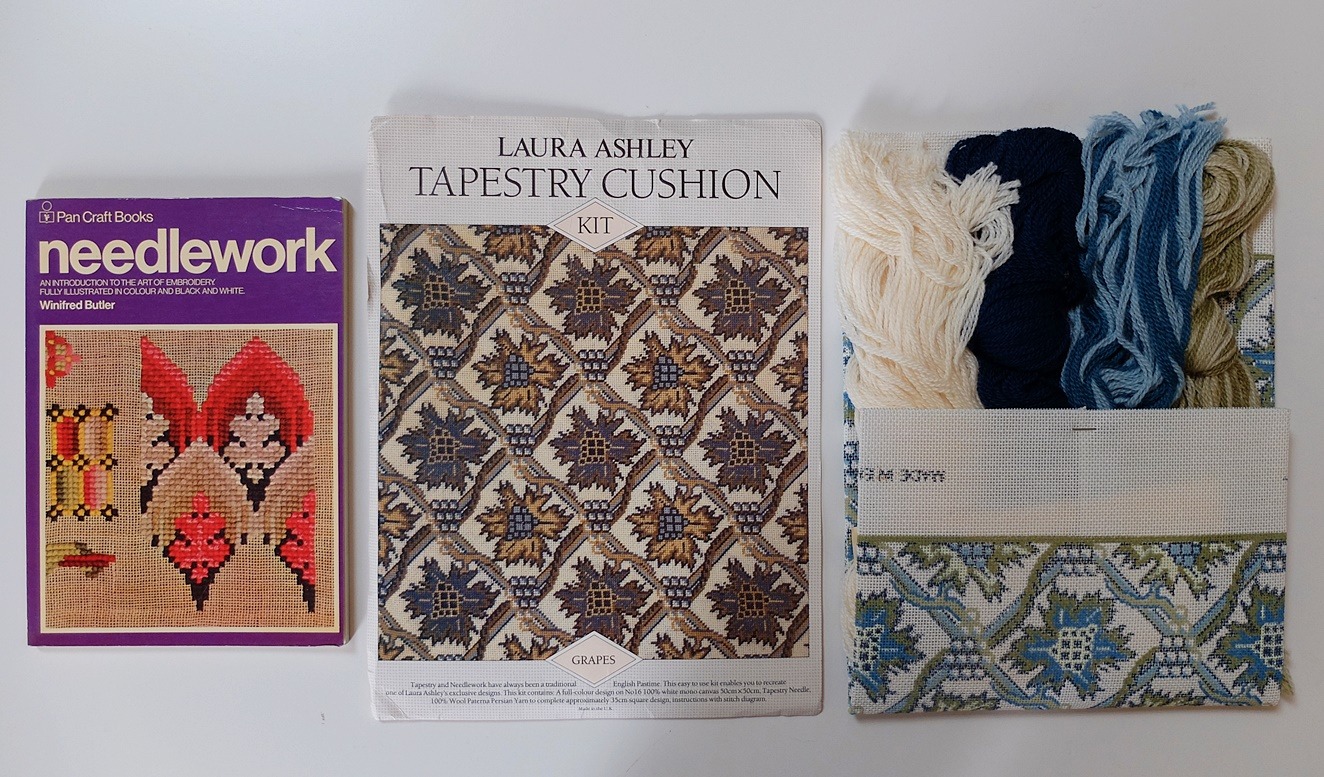 Tapisserie en Needlework zijn altijd al een traditionele Engelse bezigheid geweest. Verbazingwekkend wat er op het allerhoogste nivo is gemaakt, maar ook door gewone mensen in gewone huizen. In Engeland zijn ook altijd veel borduurpakketten verkrijgbaar geweest, met een stuk voorbedrukt stramien en genoeg wol in precies de goede kleuren en hoeveelheid. Dat levert heel veel borduurplezier op. En ook prachtige resultaten als het kussen klaar is, want de ontwerpen en kleuren zijn vaak bijzonder mooi. Dit mooie kussenpakket (uit de serie van Laura Ashley) plaats ik in m’n shop. En ook het boek Needlework, wat net als veel andere boeken eerst de rijke geschiedenis bespreekt van de oude naaldkunst, en daarna allerlei eigentijdse ideeën, ontwerpen en mogelijkheden. Voor wie zin heeft om te borduren in oude en tradtionele stijl!