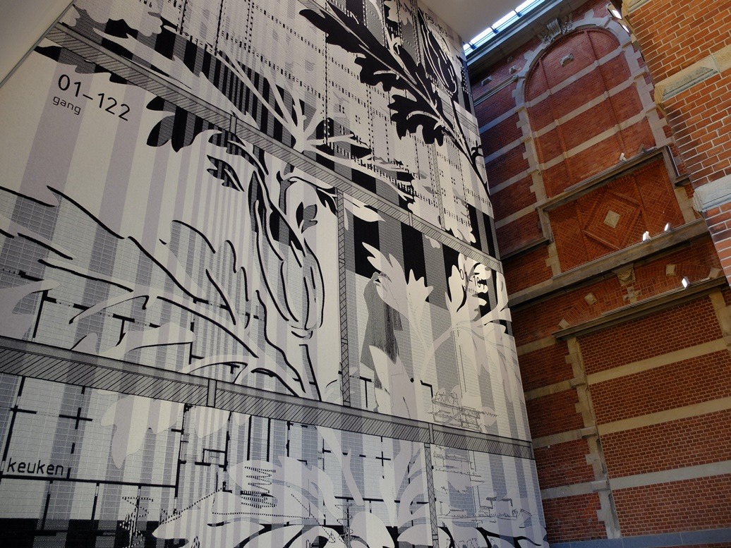 Het Museumplein in Amsterdam is een magische plek met grote aantrekkingskracht. Een mooie plek om naar toe te gaan vanwege de beroemde musea die altijd open zijn en drommen toeristen trekken. Wij waren er op tweede kerstdag en genoten van een zonnige wandeling op dit historische plekje grond waar zoveel te zien is. Je zou kunnen denken dat het altijd zo geweest is, die magische plek. Maar ooit was er op dit plekje gewoon drassig boerenweiland. Toen de stad Amsterdam ging uitbreiden werd hier o.a. het Stedelijk Museum gebouwd en dat werd nog niet zo lang geleden flink uitgebreid met een ‘Badkuip‘. Het oude gebouw en de nieuwbouw werden door dit grote wandkleed letterlijk en figuurlijk verbonden. Het wandkleed werd gemaakt door Petra Blaisse en heet “Damast”. Dit verwijst naar het eeuwenoude subtiele spel van ‘omkering’, als kenmerk van deze stof. Wanneer de ene draad aan de achterzijde is, komt de andere draad naar voren. Zo worden voor en achterkant elkaars spiegelbeeld.