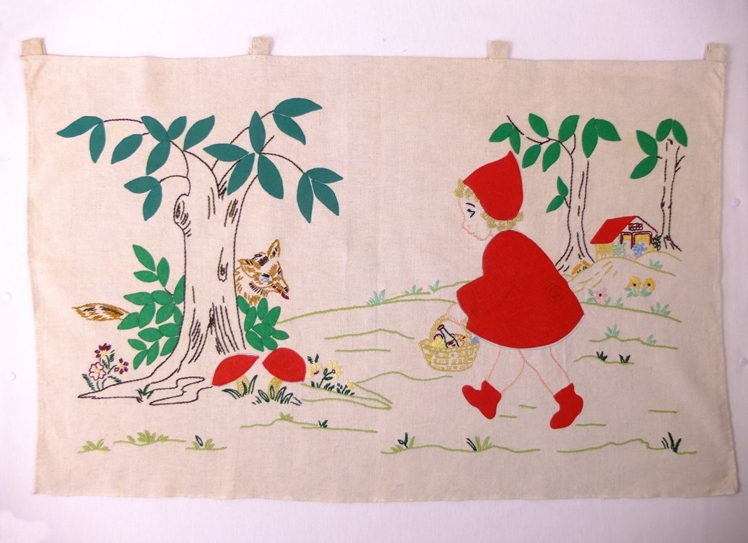 Dit is een wandkleed zoals ze vroeger vaak gemaakt werden voor boven de commode in de kinderkamer. Op mooie handwerkstof was het patroon al voorbedrukt en dit werd dan geborduurd en met vilt geappliceerd.
