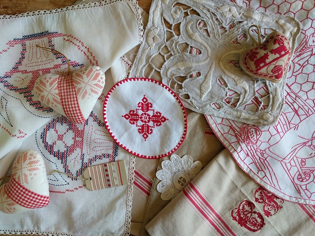 Het was ook leuk om deze handwerkjes te laten zien aan m’n schoonfamilie, tijdens ons familie-weekend in België. Een paar zwagers hadden ‘niet zoveel verstand’ van handwerk en vroegen zich af wat ik hier nou in zie. Dus kon ik vertellen: het grote kleedje is gemaakt van vrij grof geweven linnen, waarop eerst lijnen zijn getekend. Op die plekken zijn de randen gefestoneerd, en daarna de stukjes stof weggeknipt, zodat je die leuke gaten krijgt. Daarna is met vrij grof borduurgaren nog wat versiering aangebracht. En dat kleine kleedje, dat lijkt wel kant, maar het is niet met de hand geklost. Van fabriek-geweven lintkant zijn mooie krullen in een patroon gelegd en die lussen zijn met kleine steekjes aan elkaar genaaid. Dat was vroeger een snelle manier om een kant-gelijkend kleedje te maken.
