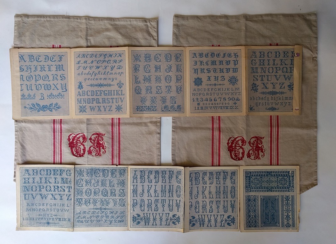 Twee kleine mono-gordijntjes met grote geborduurde monogrammen plaats ik vast in m’n shop.