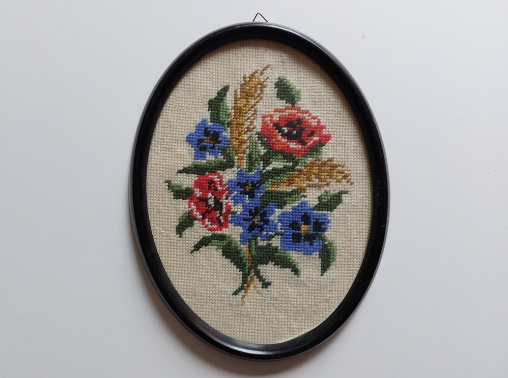 Dit schilderijtje is nog geborduurd in de tijd dat men nog niet zo bezig was met optimalisatie van de opbrengst. Die klaprozen en korenbloemen hoorden toen volop bij de zomer, en nu gelukkig op sommige plekken ook weer.
